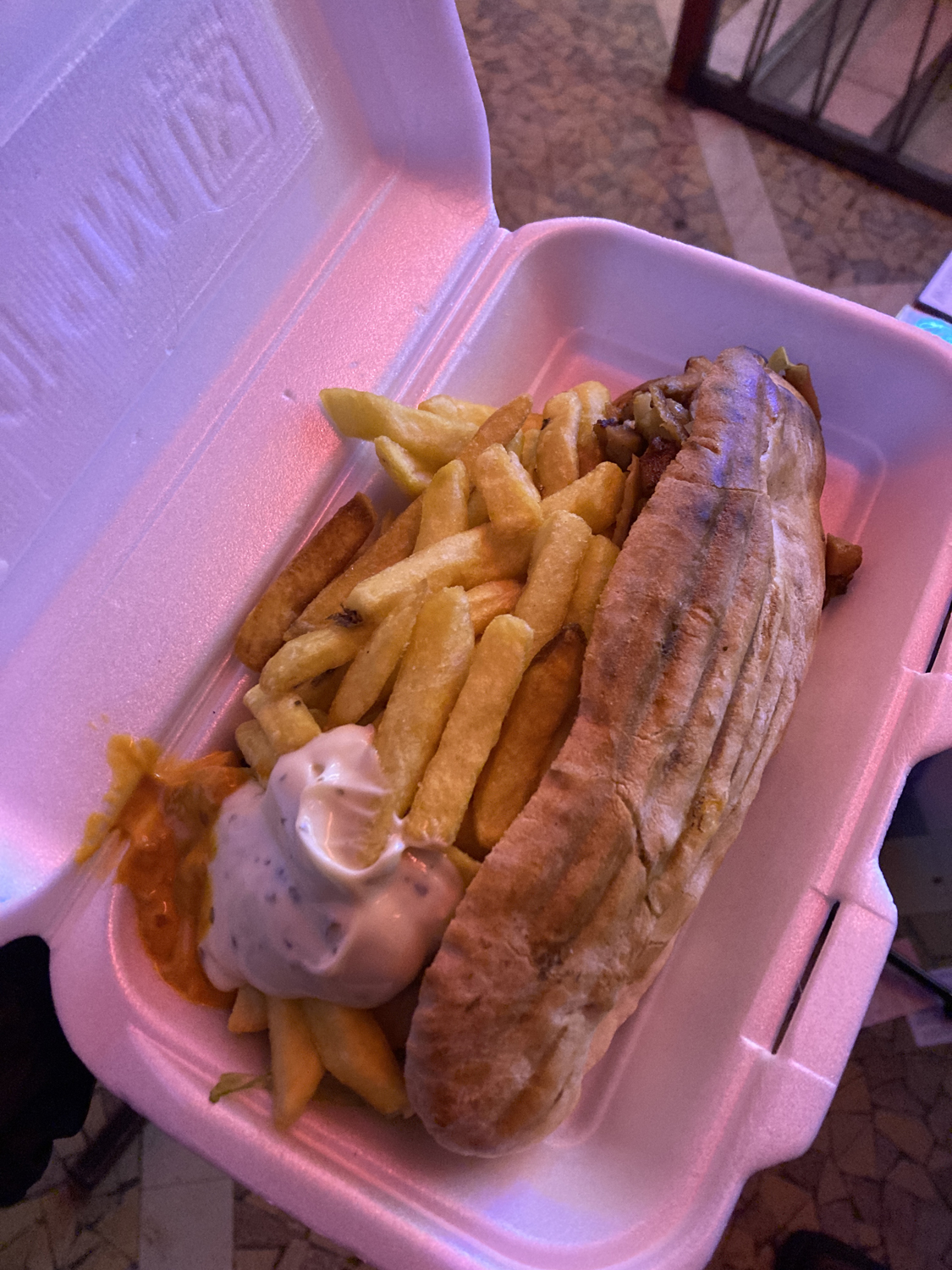 ちなみにこの日のディナーはケバブ。ピザをリクエストしていたのですが、ケバブは日本にないだろ?っていうことで近所の店で買ってきてくれました。日本にもあるよ(笑)。しかし、日本のそれとはだいぶ違って、分厚くて固めのパンに肉がサンドされていてすさまじいヴォリューム。ポテトも付いていて、よりジャンクなファストフードっていう感じでおいしかったのですが、あまりのヴォリュームでライヴ前と後で2回に分けて完食しました。