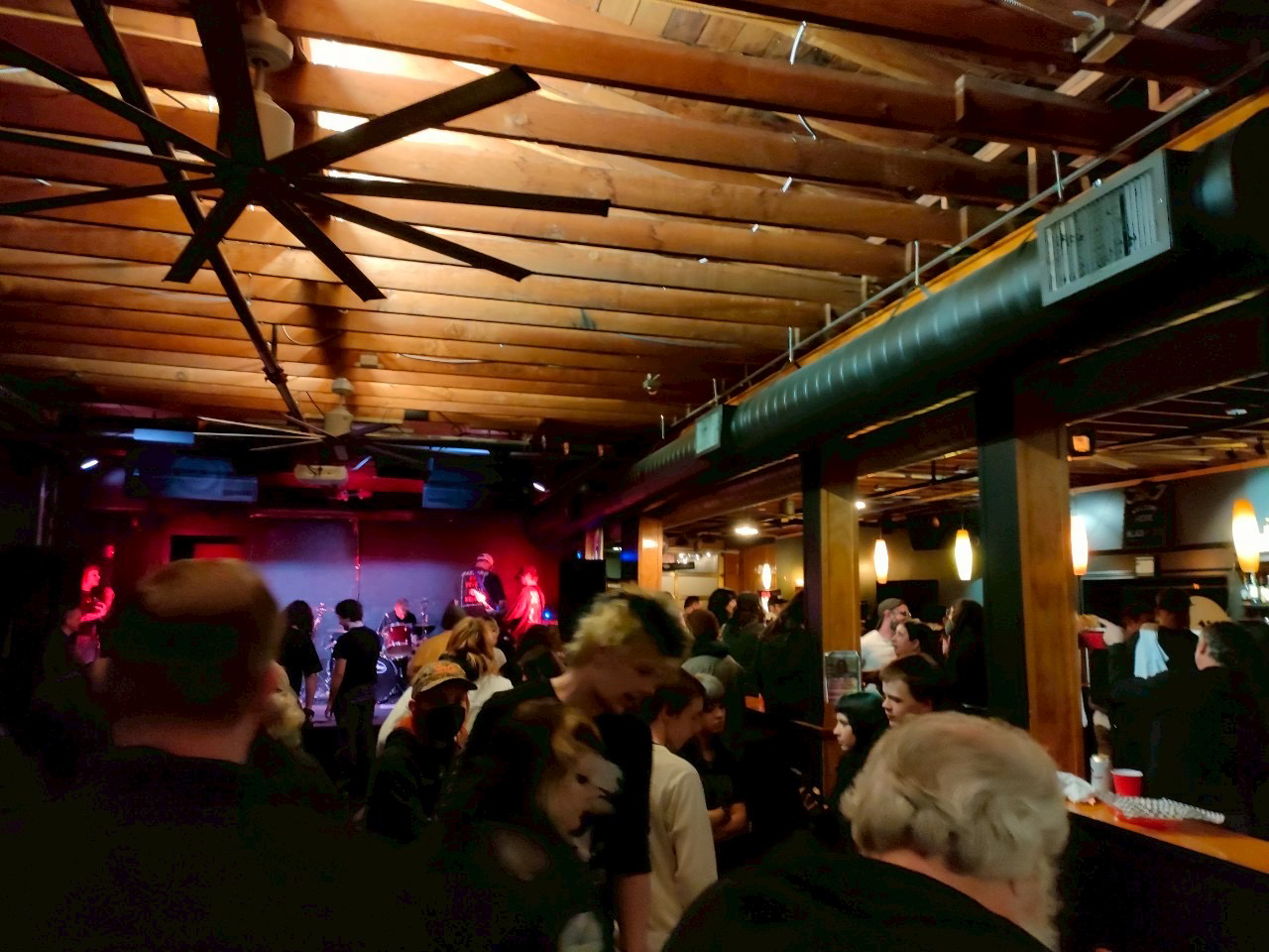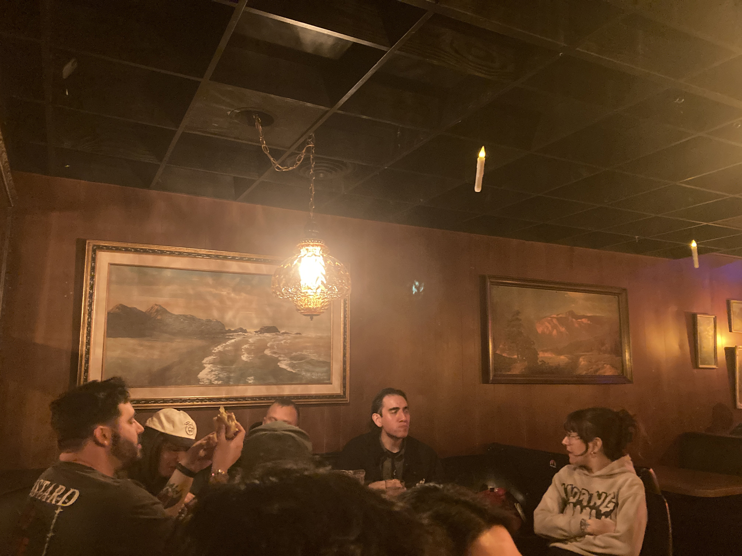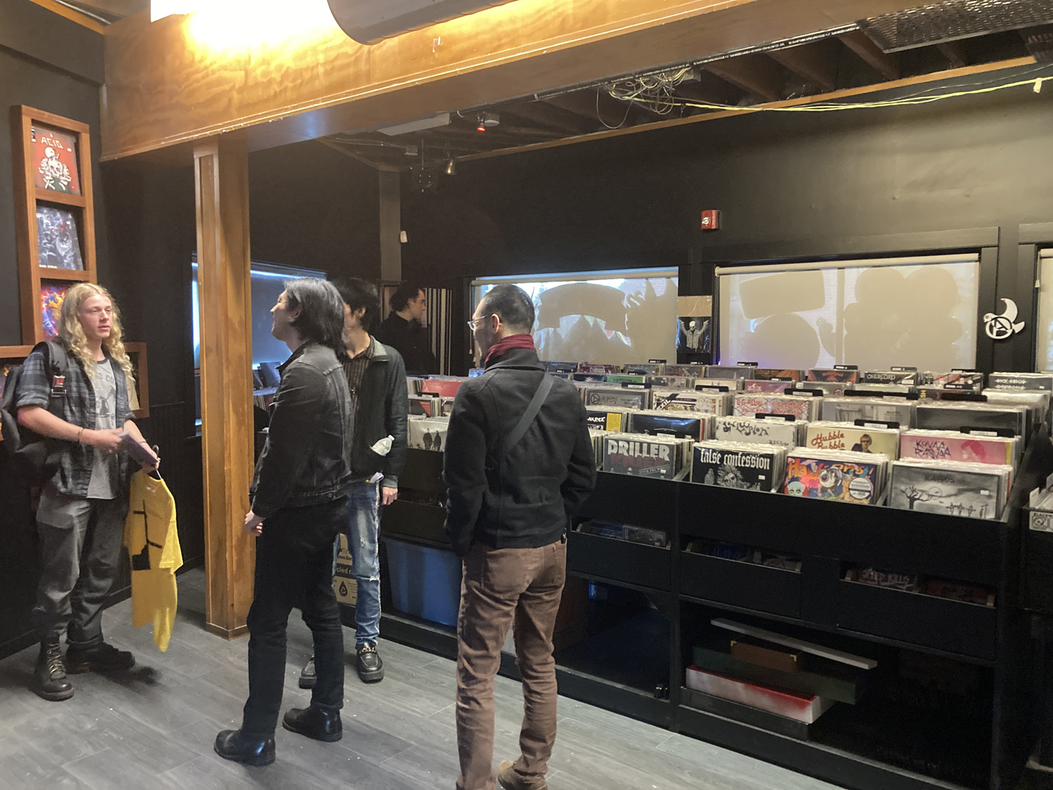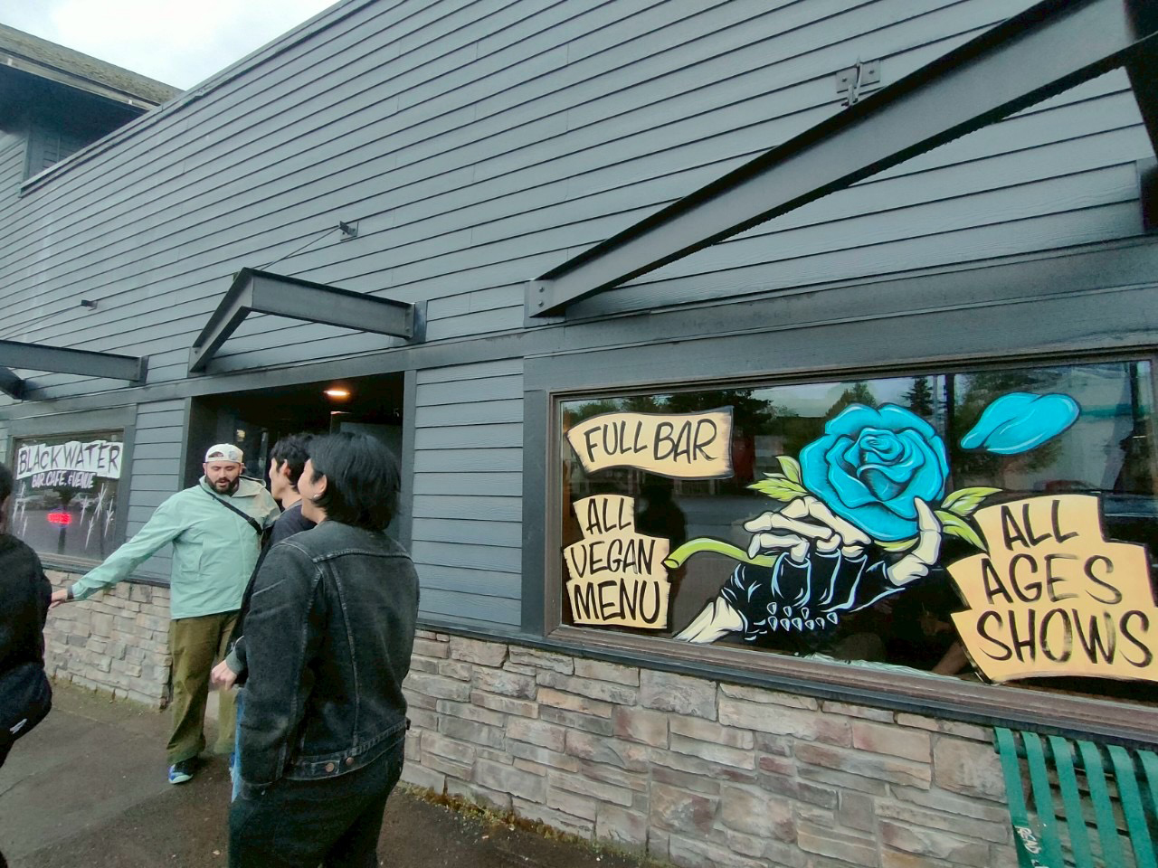 腹も膨れたところでポートランドへ向けて出発!ここからCasey、Landon、Joseもツアーバンに乗り込み、いよいよ本格的にツアーバンという様相に。Caseyがめちゃくちゃ積極的に話しかけてくれて、本当に良い奴だなとしみじみ……。ポートランド出身のバンドって何がいるっけとか雑談しているうちに、2時間ほどでポートランドのヴェニュー「Black Water Bar」に到着しました。この場所はレコード屋、ライヴ・スペース、バー兼ヴィーガン・レストランが一体となったお店で、到着した時には普通にレストラン営業をしていました。パンクの格好をした子どもが両親と食事している微笑ましい光景はなかなか日本では見られないんじゃないでしょうか。そもそもパンク・シーンに若者がほぼいないのが現状ですが……。