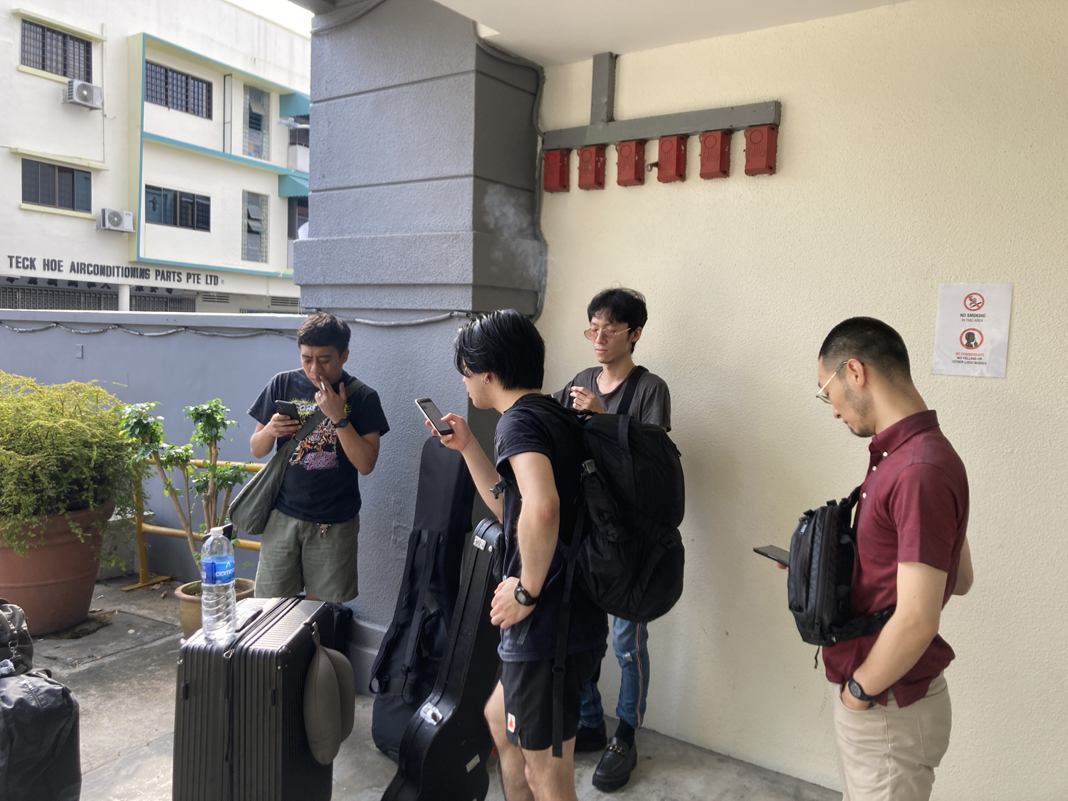 本日の会場「Rossi Musik」は、おそらくかなり古くからある伝統的なヴェニュー。CANDYやBRAVE OUTも出演したことがあるそうです。ぱっと見は完全に廃墟なのですが、1階がライヴ・スペース、2階がガチの廃墟(霊障が起きるという噂も……)、3階が楽屋兼事務所とレコーディング・スタジオ、4階がおそらくもうひとつのライヴ・スペースと、あまりにも濃過ぎる場所です。実を言うと、シンガポールでかなりの人数に「お前ら明日はRossi Musikでやるのか?あそこは地上の地獄だ!(暑すぎて)死ぬぞ(爆笑)」と言われていたので、震えながら会場入りしました。するとMiraから救いの一言が……。