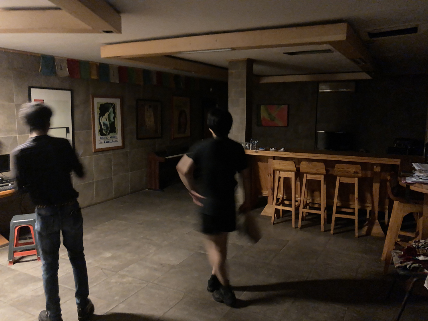 逆に今までエアコンなしでやっていたのが信じられない湿度なわけですが、これで少し安心(笑)。完全にラッキーマン状態になりました。ライヴ・スペースはコンクリート打ちっぱなしで、ドイツ・ライプツィヒで訪れたスクワット(註: ここも霊が出ます)を思い出しました。しかし、こちらはライプツィヒのそれと比べてはるかにロウな環境で、EINSTÜRZENDE NEUBAUTENの『半分人間』……とまで言うと言い過ぎですが、かなりアガりました。機材自体は普通に新しめのシステムでしたが、照明が蛍光灯だけなのも逆にカッコよかったです。
