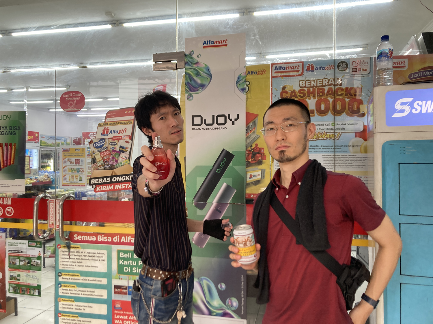 オープンまで少し時間があったのでメンバー4人で周辺をふらついてみることに。やはり現地のコンビニ事情とか気になるよねということで、近所にあったコンビニ大手のひとつ「Indomaret」に行ってみることにしました。しかし、Indomaretがあるのは道路の向かい側。殺人的な量の車とバイクが行き交う上に信号も見当たらず、渡る勇気が出ずに諦めました(笑)。もう少し歩けば別のコンビニ大手「Alfamart」があるようだったので、迷わずそちらへGO!