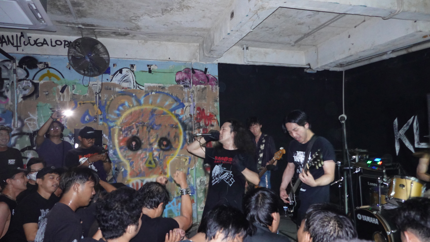 そしていよいよ我々の出番!外でたむろしていた人たちもちゃんとライヴ・フロアに入って来てくれて一安心(笑)。エアコンがあるとは思えないほど灼熱のフロアでモッシュ & ダイヴの嵐……。人生でトップレベルに汗かいてマジで倒れるかと思いましたが、観客のピュアで凄まじいエナジーに突き動かされました。普段汗を全くかかないZieが珍しく汗だくになっていたことからも凄まじい暑さと湿度が伺えるでしょう。アンコールは機材トラブルもありましたが、筆者とZieのツイン・ヴォーカルで無事(?)乗り切り、東南アジア・ツアー最終公演の幕を下ろしました。動画がYouTubeにいくつか上がっているようなので、ぜひチェックしてみてください!