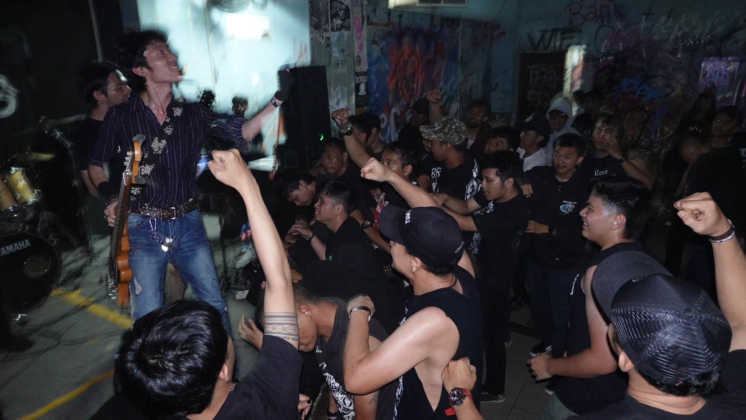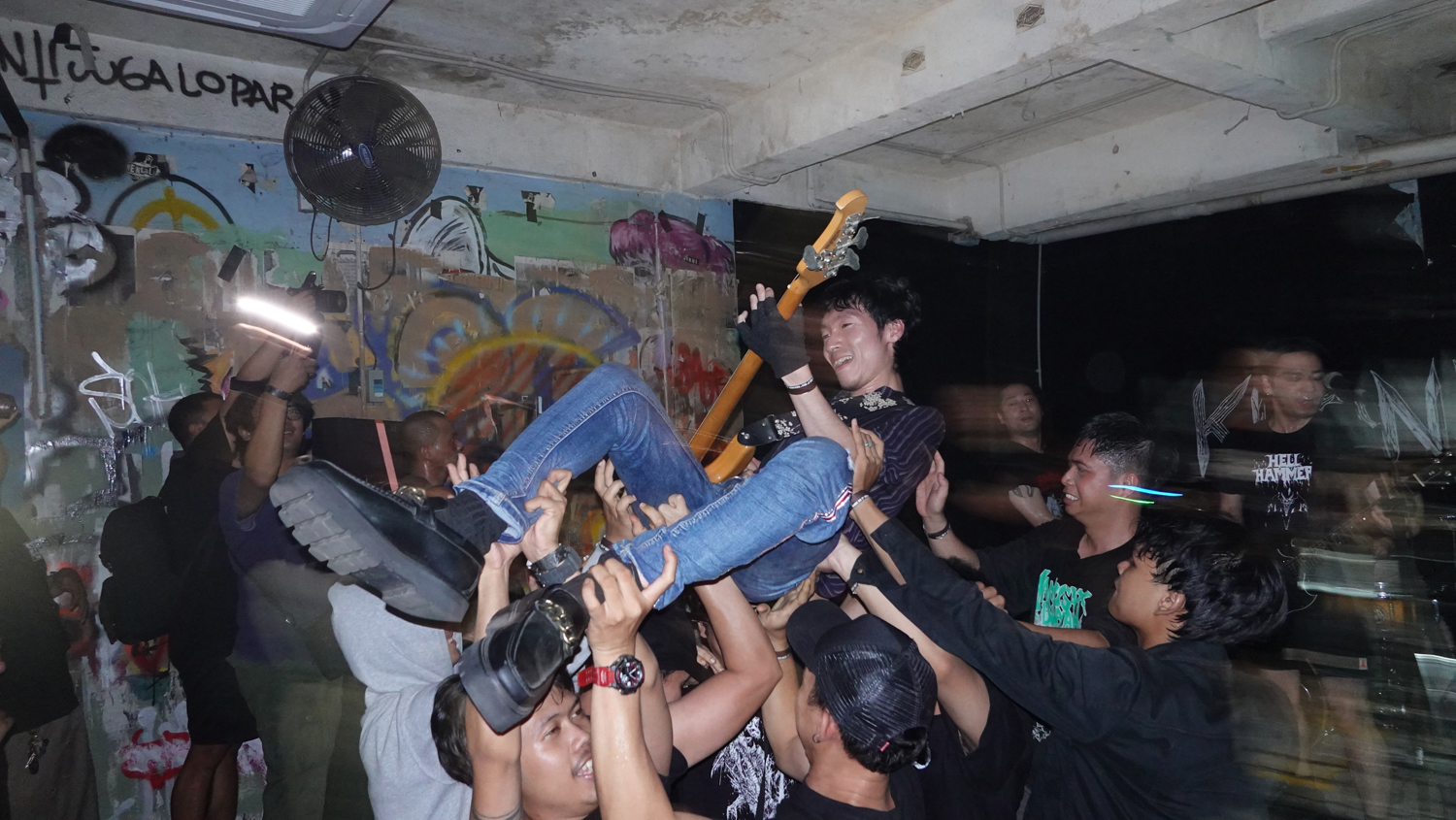 しかし、4バンド目のBRIGADE OF CROWから少しずつフロアのボルテージが上がっていきました。Andro(Kristian)の友人デザイナーのTekknovoid氏がドラムを叩いてるバンドゥン出身のバンドで、MOTÖRHEADウォーシップな革ジャン・ロッキン・ハードコア・パンクメタルでダイヴの嵐を巻き起こしていました。