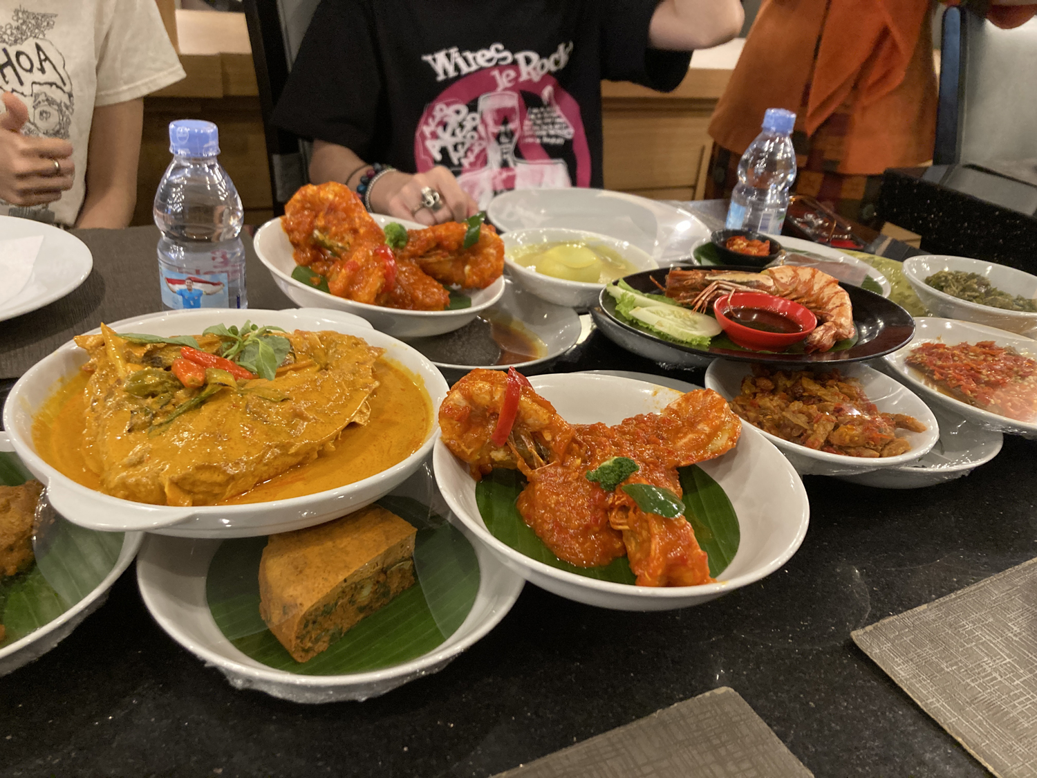 Saifulの車で10分ほど移動すると、何やら高級そうなレストランに到着。お祝いの日などに来るようなお店らしく、テーブルにはラップがかけられた料理が大量に並べられていました。しかし、これは食べ放題というわけではなく、ラップを開けた分だけお会計するというシステムとのこと。危なかった……。カレーらしき料理を食べてみたのですが、ブルータルすぎるスパイスの量で見事に死にかけました。FarhanとMira曰く、東南アジアの中でインドネシアの料理が最も辛いそうで、Miraも普通に大ダメージを受けていました(笑)。