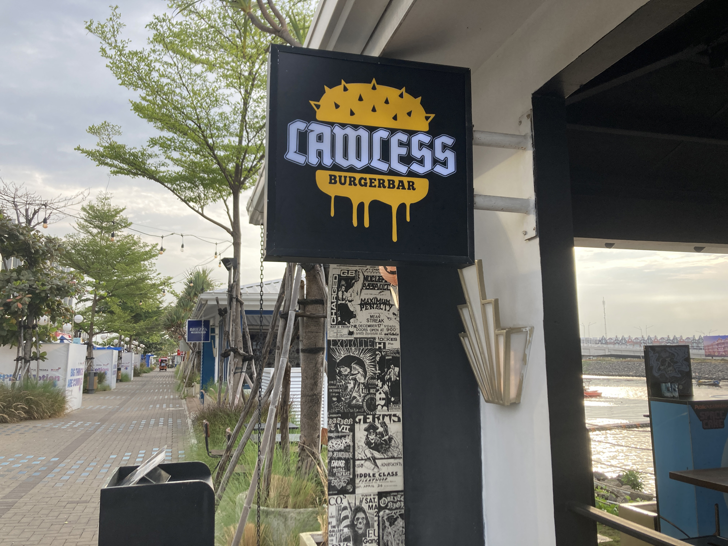 辿り着いた海岸は所謂ビーチのような雰囲気ではなく、港区を思わせる感じのショッピング・エリアでした。珍しくビールが買えるレストランがあるとのことで、「Lawless Burger」というハンバーガー屋でビンタンのレモンビールをテイクアウト。ちなみにパンク / ハードコア関係のかたが経営しているお店なのだそうです。