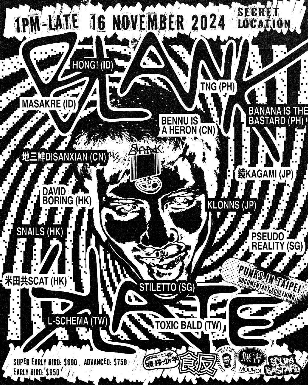 「BLANK SLATE」はCedricと「食反 SICK FAN」を運営するAdriannaの2人がメインの主催。さらに共催として中国のプロモーター「Triple Stone Booking」、同じ中国・広州のショップ「Portal」、台湾のパンク・コレクティヴ「Suck Glue Boys」も名前を連ねています。結果、アジア7ヶ国から全14バンドが集まるフェスティヴァルとなりました。ちなみに最初にもらった出演者候補のバンド・リストには他にも日本のバンドの名前があったのですが、最終的には我々KLONNSと鏡 KAGAMIの2バンドに落ち着いたようです。
