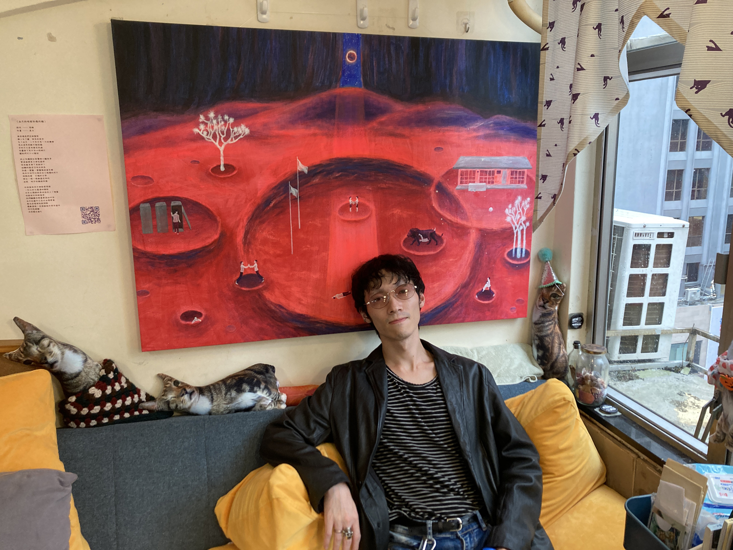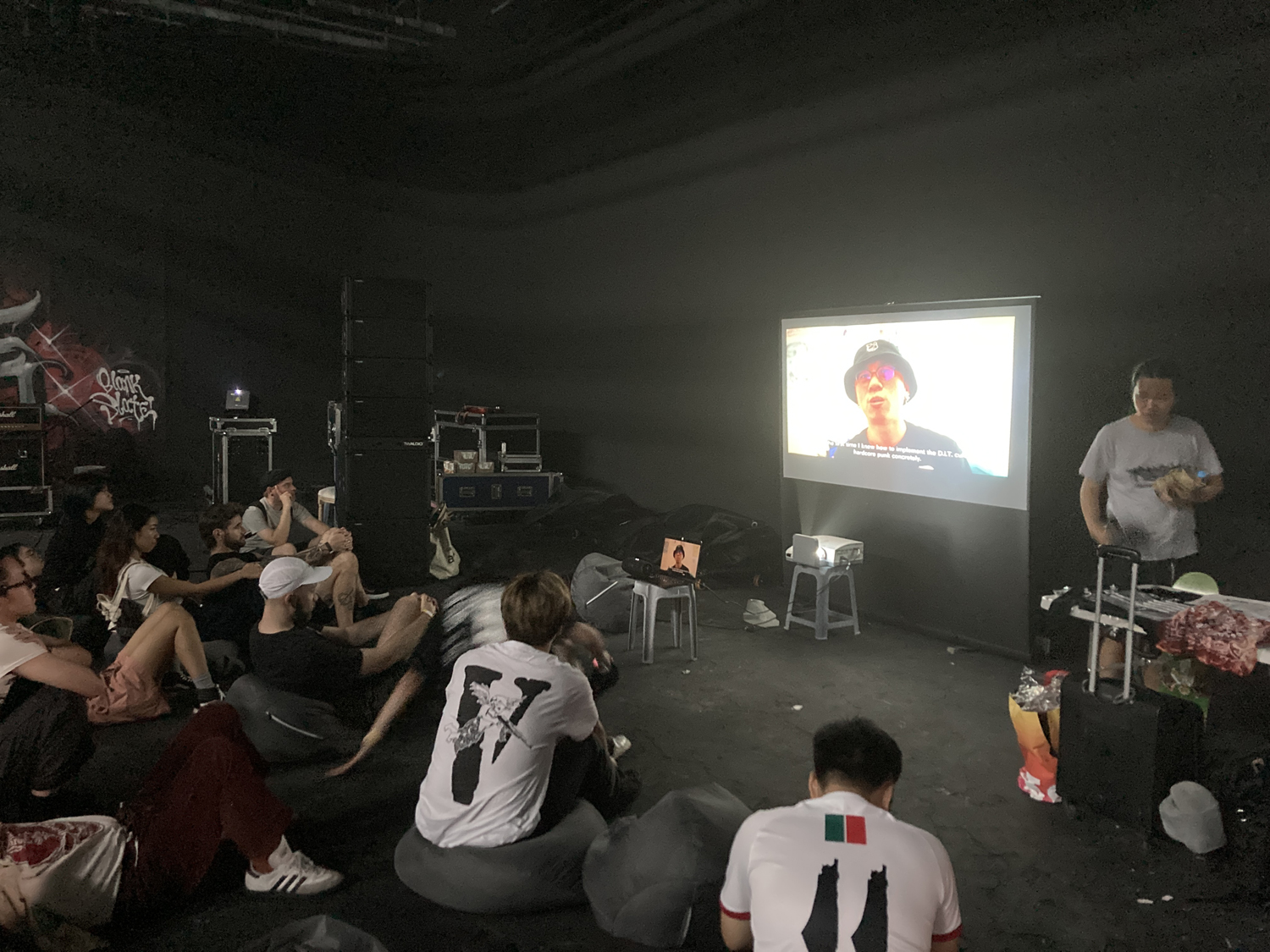 なぜクッションが転がっているのかというと、フェスのオープニングで香港のパンク・バンド米田共 SCAT(諸事情で出演キャンセルとなりました)のメンバーでビデオグラファーでもあるJoeが撮影した台湾パンクシーンのドキュメンタリーの上映会が行われるからです。せっかくなので腰を据えて観てみると、Suck Glue Boysの面々やDEFEAT THE GIANT、さらにはコーヘイなど、知っている顔ぶれしか出ていなくて笑いました。なぜコーヘイが出ているのかというと、Joeは2023年のKLONNS & 鏡の台湾ツアーにもTOXIC BALD & L-SCHEMAのジャパン・ツアーにも来ていたのでした、ちなみに。