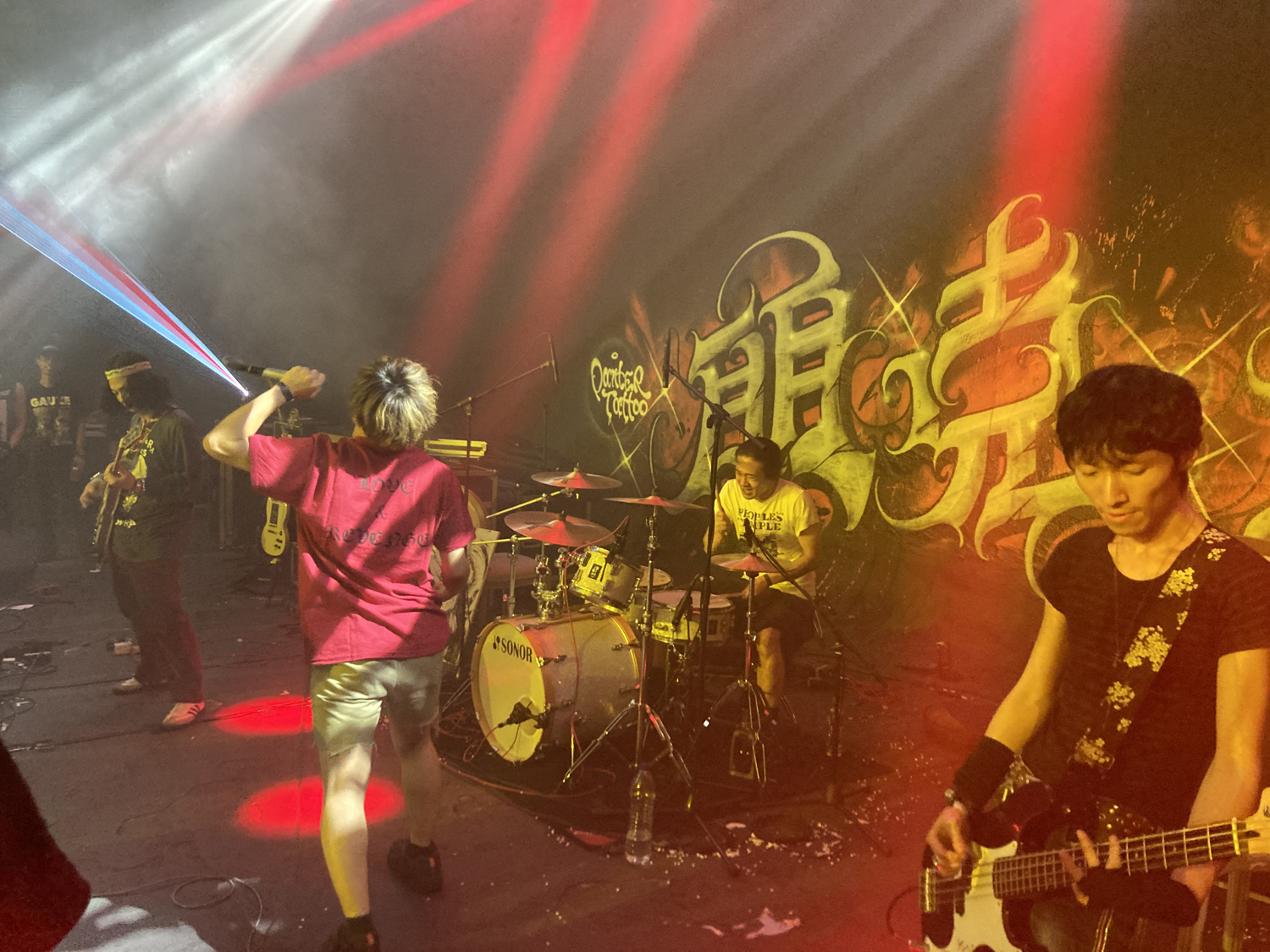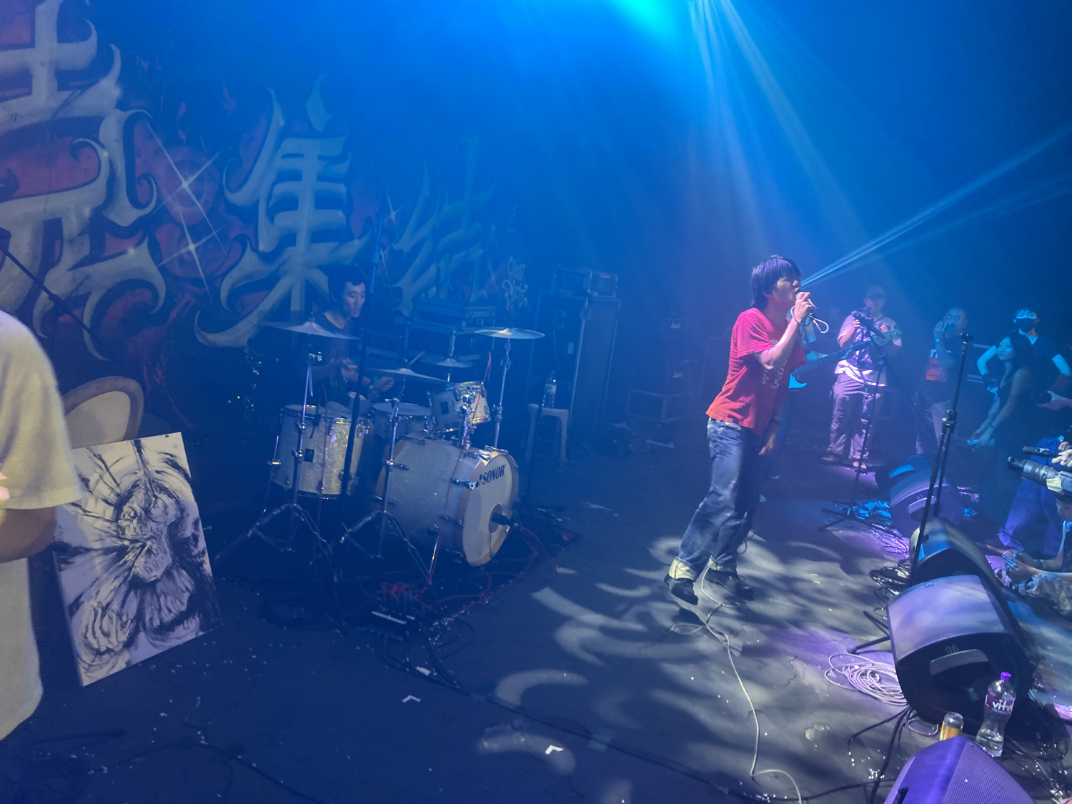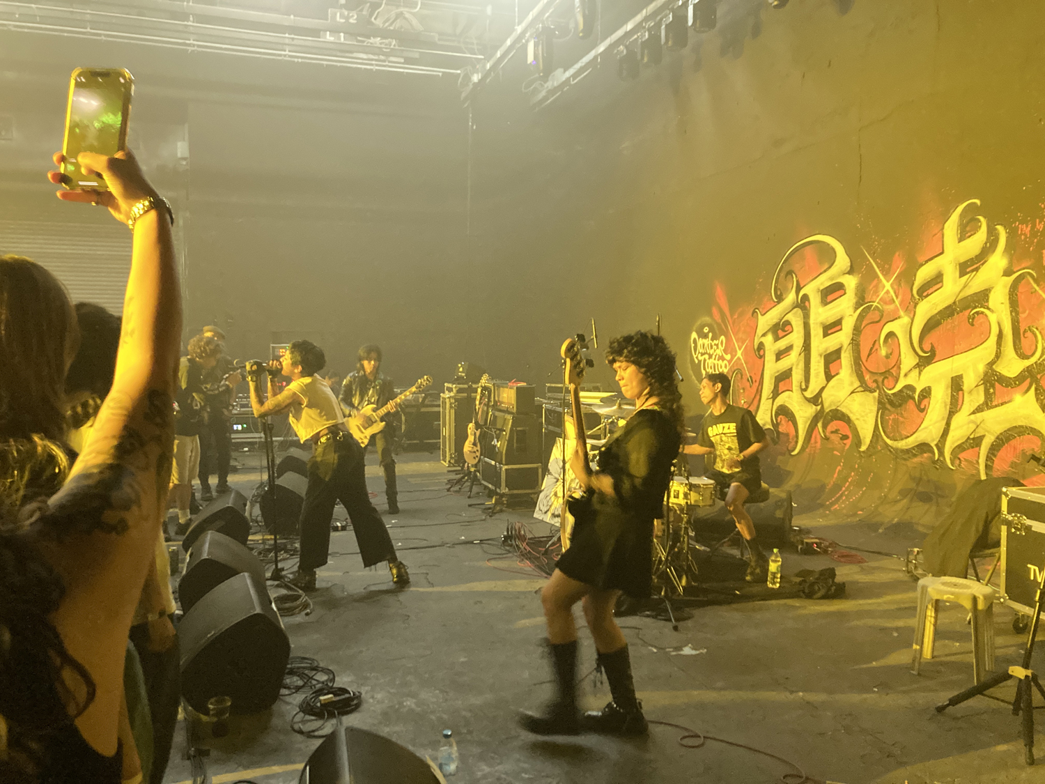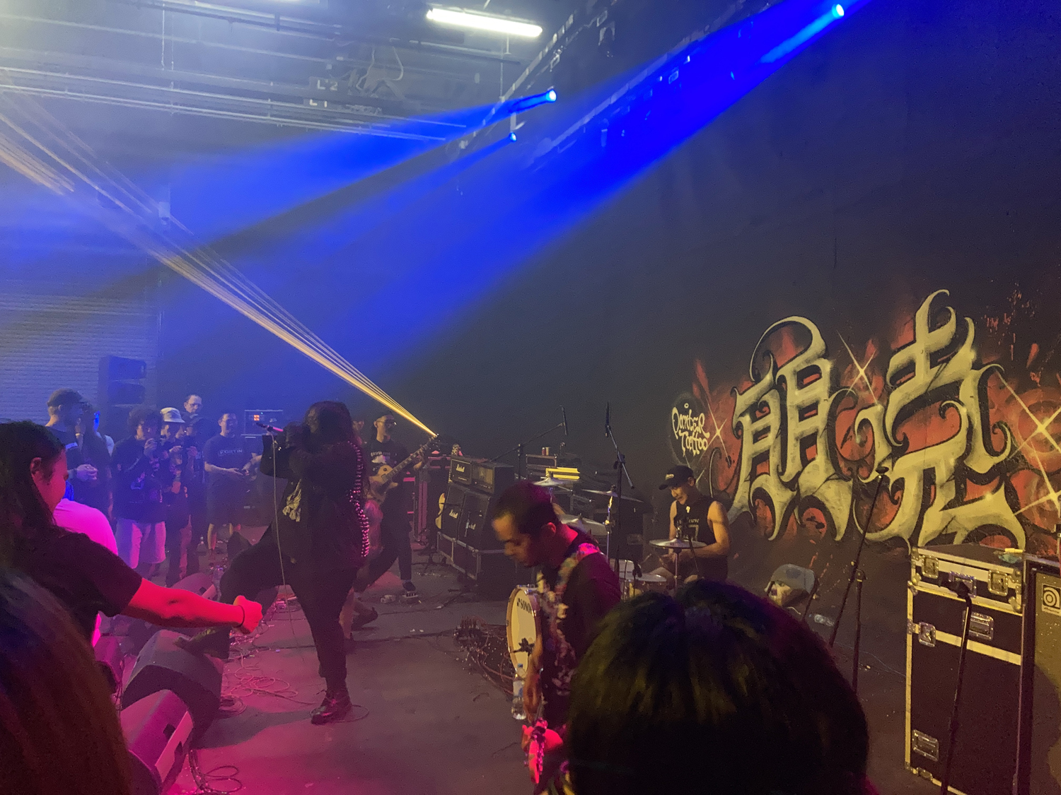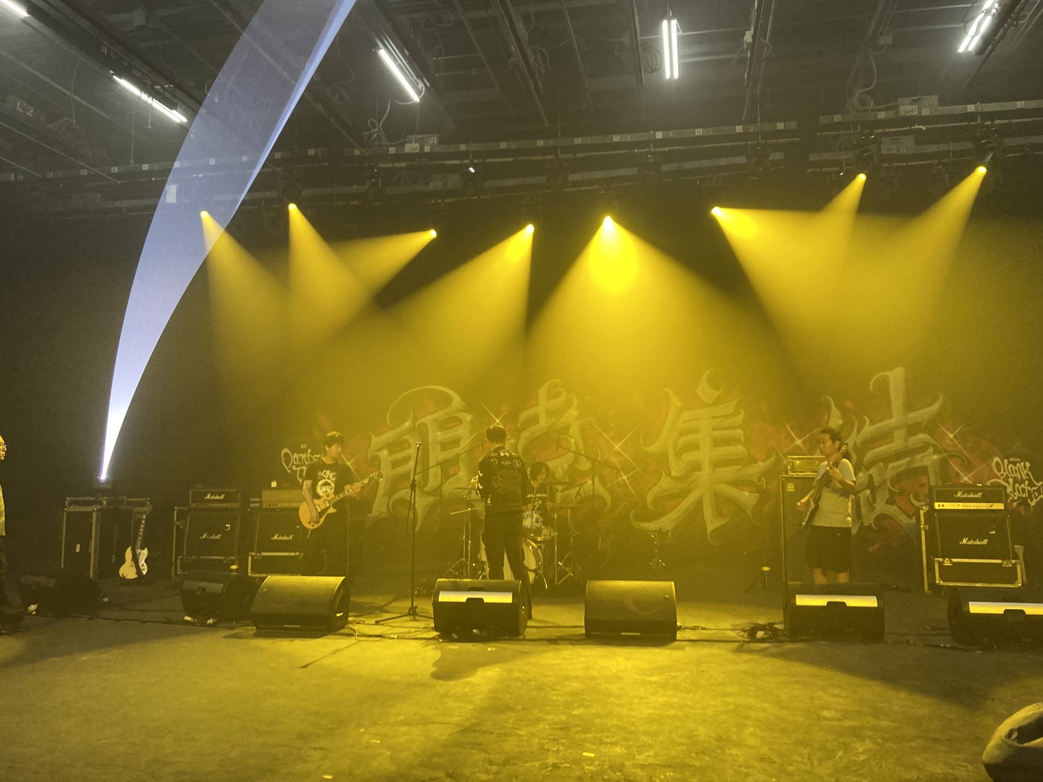 今回の会場は通常のライヴハウス的な場所ではなく、映画などに使う撮影スタジオに音響システムを持ち込んだ特設ステージ。本当はイベントをやってはいけない場所らしく、かつ政府の検閲を避ける必要もあって会場名はシークレットとのこと。壁にペイント(消せるのかコレ……?)も施されており、かなり気合が入っているというか写真映え力高い感じでした。キャパシティは入れようと思えば500人くらいは入るだろうなという広さ。音響はサウンドチェックの途中でシステムをがっつり変えるなど、正直手探り感が否めませんでしたが、自分たちとしては広めの会場のほうが音が作りやすいので、そこまで苦労はしませんでした。