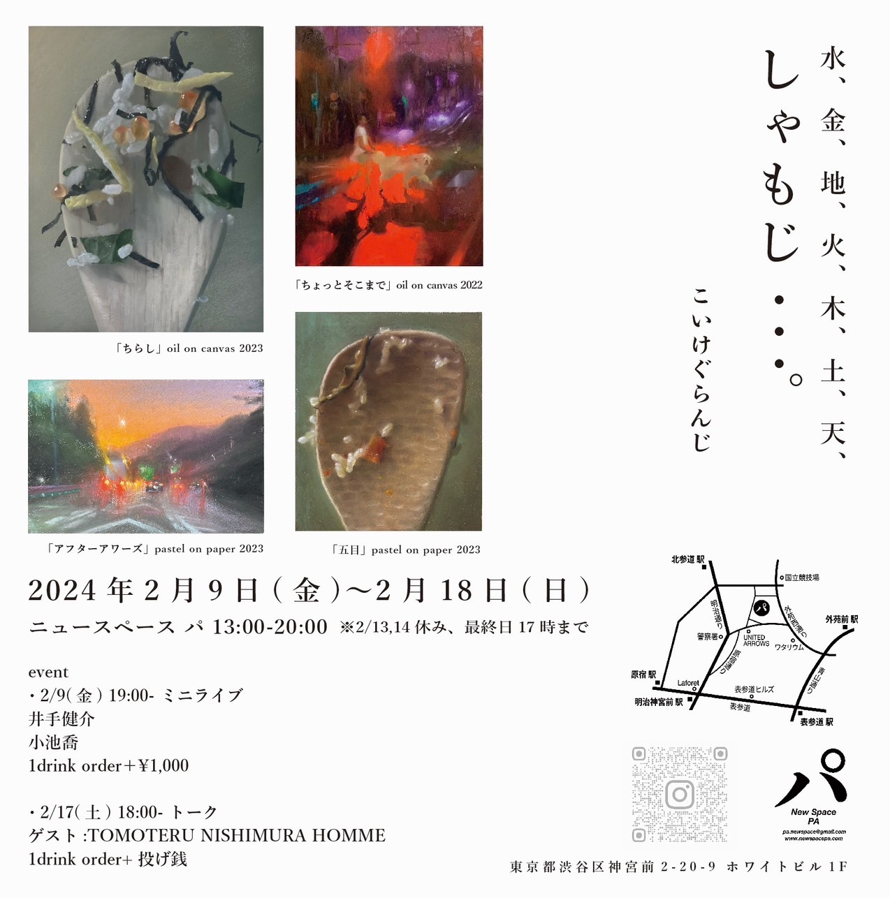 小池 喬(Takashi Koike)名義では名古屋を拠点に活動するバンド・シラオカのギター・ヴォーカルを担当し、2021年に2ndアルバム『さばげー』を「7e.p.」より発表しているこいけ。「水、金、地、火、木、土、天、しゃもじ…。」には油絵を中心に作品を出展するほか、ポスターなどのマーチャンダイズも販売。会期中の2月9日(金)は、井手健介を迎えてのミニ・ライヴ、17日(土)にはTOMOTERU NISHIMURA HOMME(西村友輝)とのアーティスト・トークも実施されます。