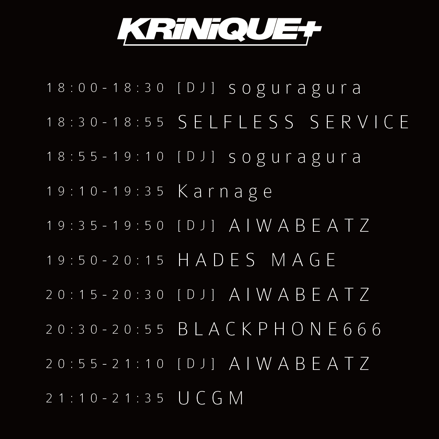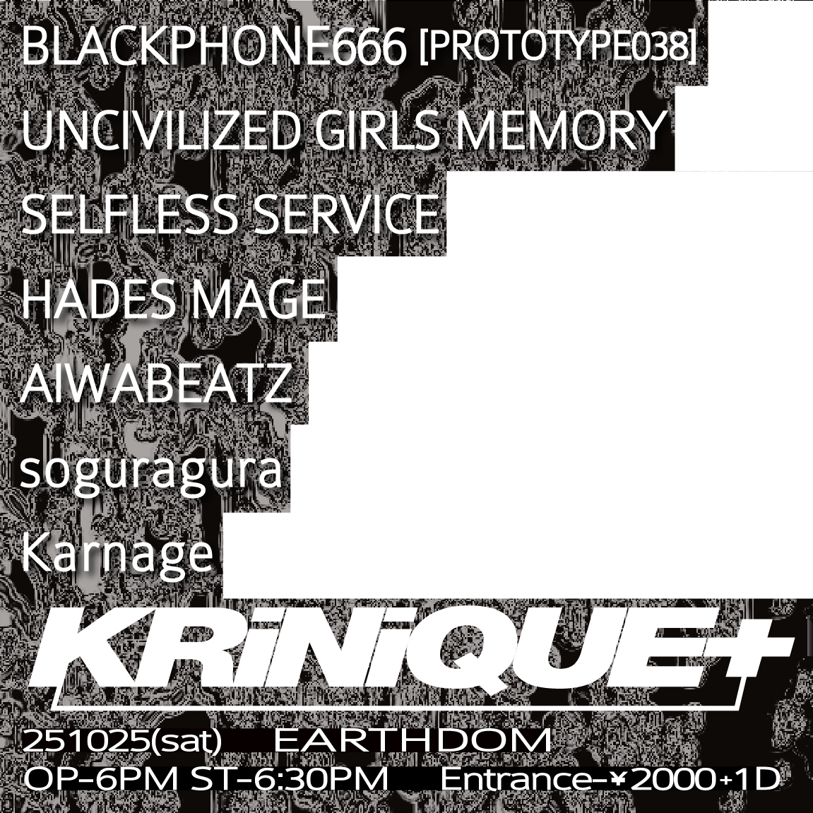 同公演は、UNCIVILIZED GIRLS MEMORYが不定期に開催しているシリーズ「KRiNiQUE」のエクスパンデッド・エディションとして開催されるもの。UNCIVILIZED GIRLS MEMORY、hades mageに加えて黒電話666、Karnage、SELFLESS SERVICE(DHALIA, NEEDLESS, Skin Job)がライヴ・パフォーマンスを行うほか、DJとしてAIWABEATZ(6LVCK H3RXN, AIWASTONE)、soguraguraの出演も決定しています。