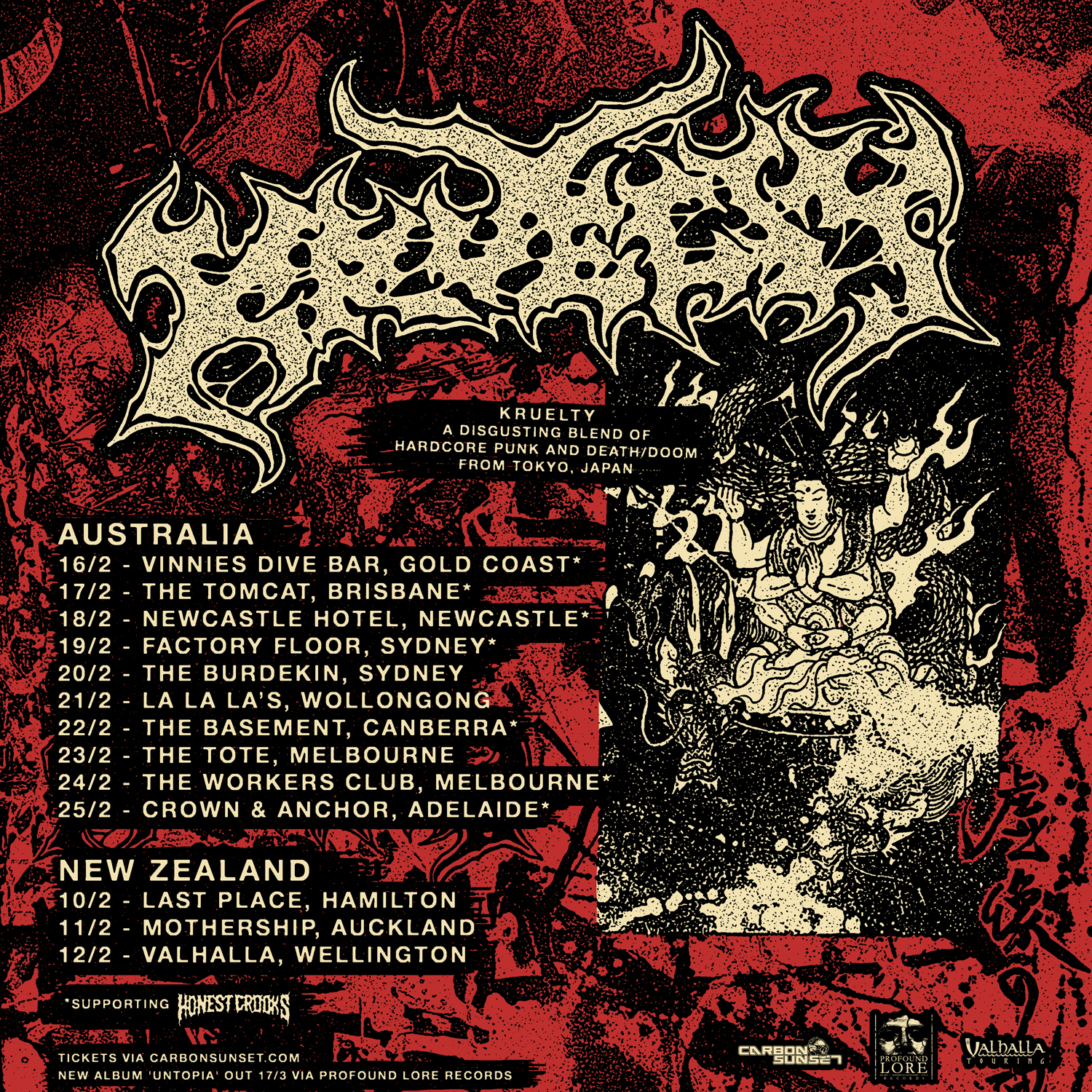 2017年に東京にて結成された彼らは、現在までに2枚のフル・アルバムと、5枚のシングル、4枚のスプリットという、異常とも言えるハイペースで音源をリリースする傍ら、COVID-19が終焉に向かいつつあった2022年以降、現在までにアメリカツアーを2回、ヨーロッパツアーを2回、東南アジアツアーを2回、オーストラリア / ニュージーランド・ツアーを1回、さらには東アジア・ツアーを1回と、なんとこれまでに計19ヶ国でのライヴを敢行。もちろんその間に国内でもコンスタントにライヴ活動を並行して行い、「Bloodaxe Festival」や自らが主催する「ROTTING NOISE TOKYO」といった大型ハードコア・フェスにも出演し、常に休むことなく活動を続けている。