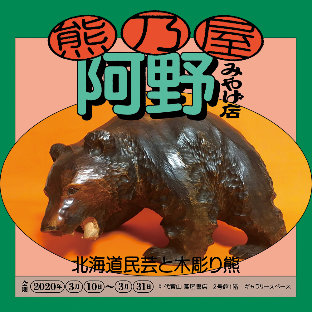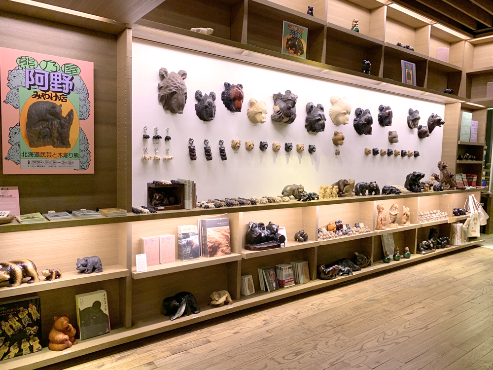 昭和30〜50年頃に北海道観光ブームとともに土産物として大量に製造・販売され、時代の流れや生活様式の変化に伴って土産物としての需要は減少しているものの、近年はアイヌ文化伝承・保全活動の高まりや、北海道・八雲町「木彫り熊資料館」の開館、東京903会著『熊彫図鑑』(プレコグ・スタヂオ)の刊行、アイヌの熊彫り職人・彫刻家である藤戸竹喜の展覧会が日本各地で開かれるなど、幅広い世代から注目を浴びている“木彫り熊”。昭和40年頃の創業以来、北海道支笏洞爺国立公園内の昭和新山にて北海道民芸を扱う土産店「熊乃屋阿野みやげ店」は、北海道民芸および木彫り熊の魅力を伝えるべく、全国で出張販売・展示を行っています。