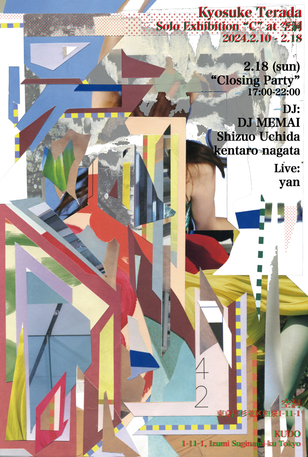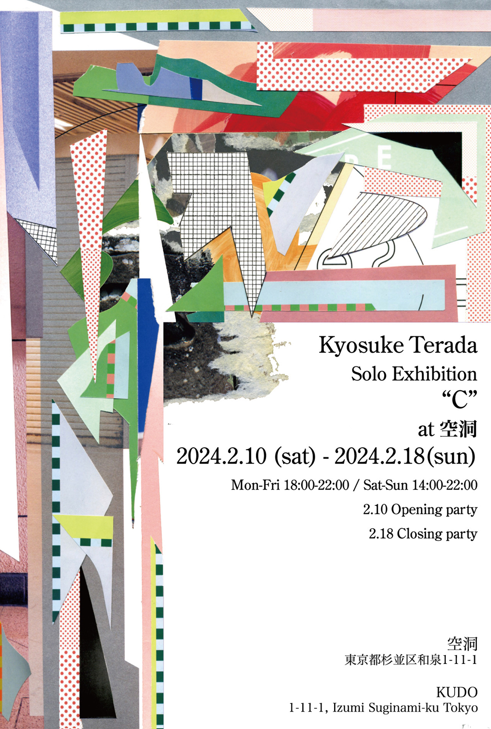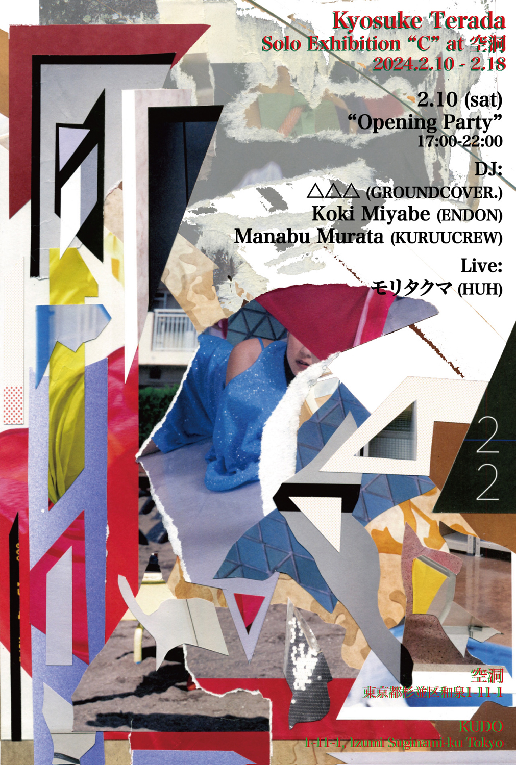 BAY CITY ROLAZ(w/ 永田健太郎)、HUH(w/ 森 拓馬)、THE OBEY UNIT(w/ DJ MEMAI)、PRAYMATE(w/ 宮部幸宜 from AKBK, ENDON, TRIADOF13TH)などの一員としてのみならず、様々な表現手法を用いて美術フィールドでも精力的に活動するKyosuke Teradaが、コラージュ / ペインティング作品を中心に出展するソロ・エキシビション「C」を昨年東京・代田橋にオープンしたばかりのオルタネイティヴ・スペース「空洞」にて2月10日(土)から18日(日)まで開催。