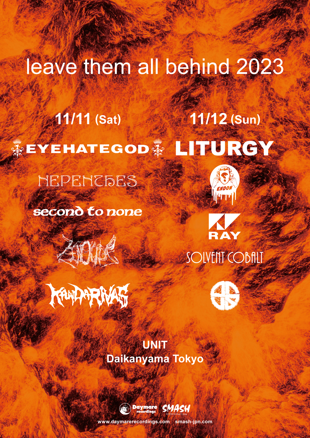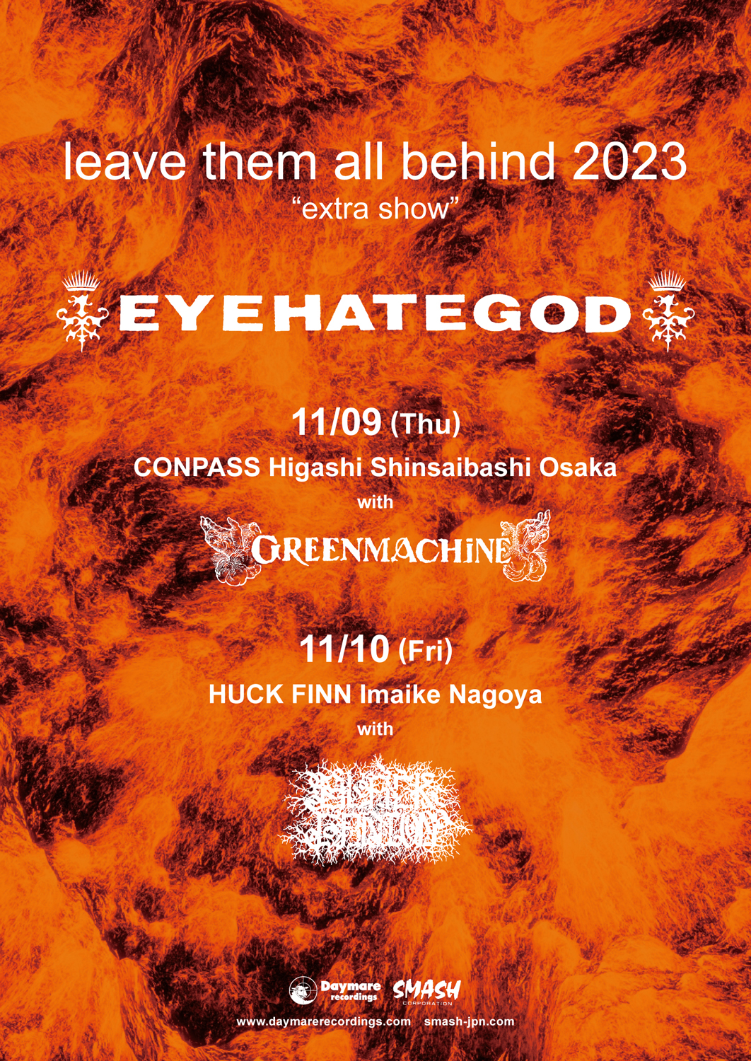 11月11日(土)、12日(日)の2日間に亘って東京・代官山 UNITにて開催される「Daymare Recordings」企画のエクストリーム・ミュージック祭典「leave them all behind 2023」。同公演のヘッドライナーを務めるEYEHATEGODとLITURGYは、各々単独で関西 / 東海エリアでのエクストラ・ショウが決定しています。