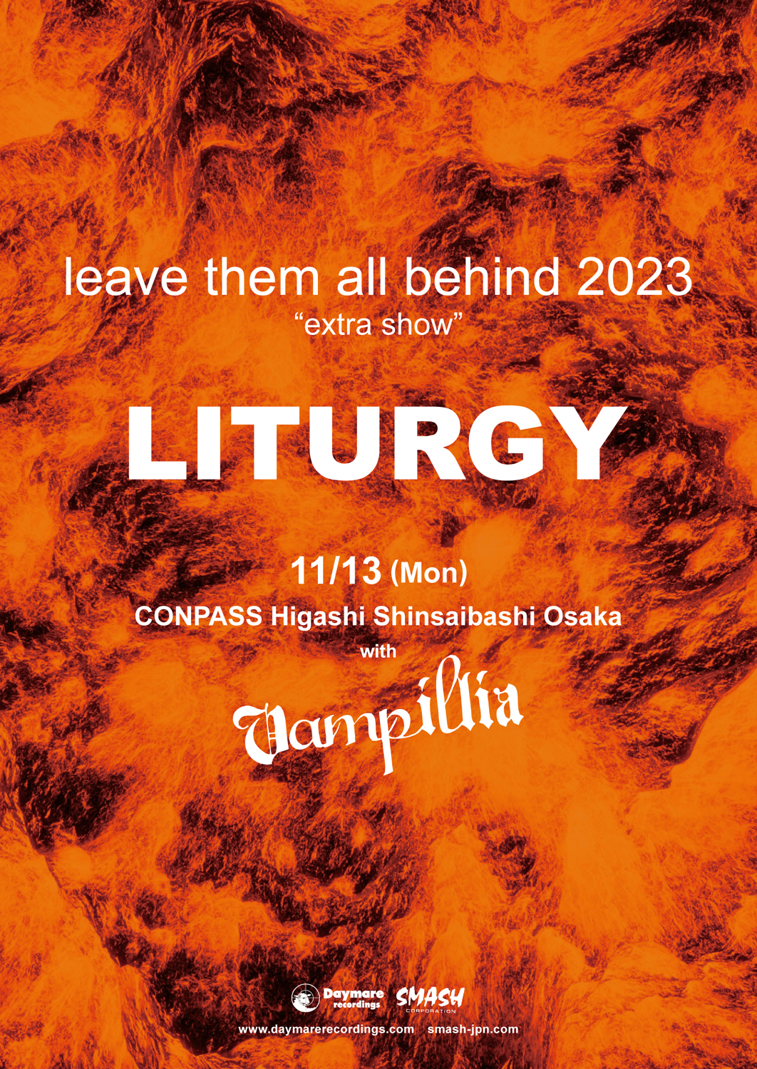 EYEHATEGODは11月9日(木)大阪・東心斎橋 CONPASSと10日(金)愛知・名古屋 HUCK FINNの2公演。大阪ではGREENMACHiNE、名古屋ではBLACK GANIONとの2マン・ライヴが予定されています。11月13日(月)に大阪・東心斎橋 CONPASSにて開催されるLITURGYの公演にはvampilliaが出演。
