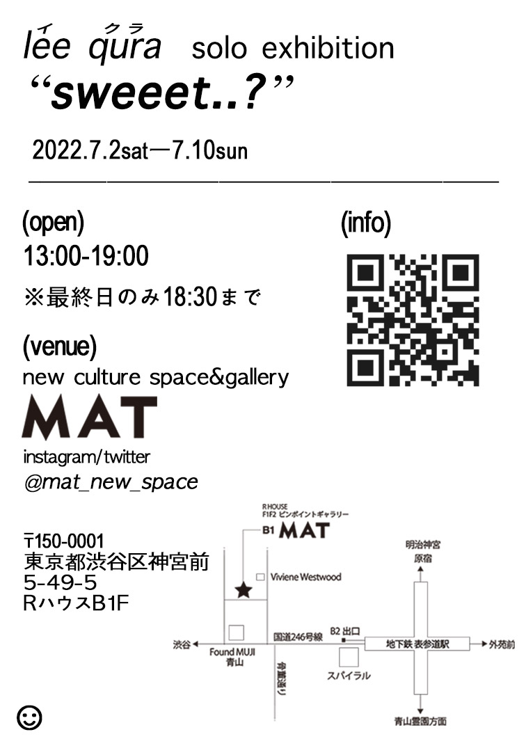 昨年6月に東京・銀座 月光荘サロン 月のはなれにて個展「Borborygmi」を開催したlee qura(イクラ)が、同展以来約1年ぶりのソロ・エキシビション「sweeet..?」を7月2日(土)から10(日)まで東京・表参道 MATにて開催。