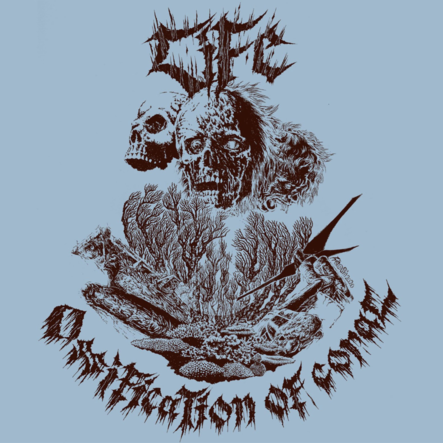 おなじみNoise Room Recording Studioにて小林重典(CROCODILESKINK, GOUM, PSYCHOTOBLACK, SNOWLINE)エンジニアリングのもとで制作され、“珊瑚の骨化”と題された同作は、ABRAHAM CROSS「Same As War」のカヴァーを含む全13曲。クラスト・パンク作品としては異色のブルーを基調にしたジャケットは、“海”をイメージしているとのこと。アートワークは引き続き、LiFE過去作やFRIGÖRAなどのヴィジュアルでも知られる野崎 宙(BUTTHEAD 3g, COLLAPSE SOCIETY, DECONSTRUCTION, STAGNATION)が担当しています。日本盤は、SCHIZOPHRENIAのメンバーが営む岡山・津山のプリンティング・カンパニー「ウシロダ工房」によるシルクスクリーン印刷。発売に先駆け、Acclaim CollectiveのBandcampでは収録曲「Endure Every Day」「Crush Them」のフリーDL(NYP)が実施されています。