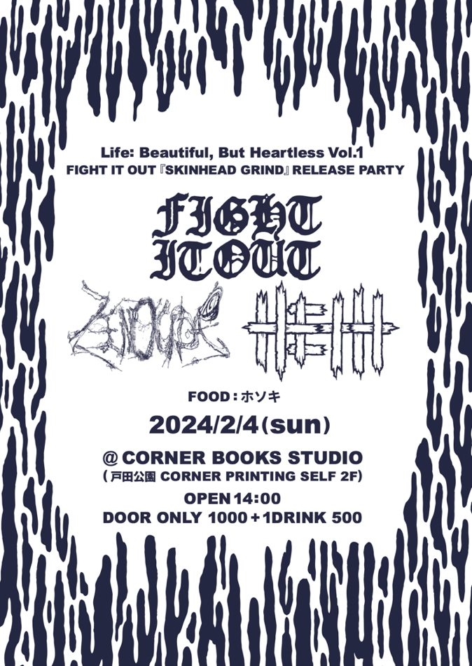 SAIGAN TERRORとのスプリットEP(2017, Fairly Social Press)を挟み、3rdフル・アルバム『Most Hated』(2017, BOWLHEAD Inc.)以来実に6年ぶりの新作『Skinhead Grind』を引き続き「BOWLHEAD Inc.」より昨年11月に発表して話題となった神奈川・横浜のフル・オブ・ヴァイオレンス、FIGHT IT OUT。そのリリース・パーティを兼ねたライヴ・イベント「Life: Beautiful, But Heartless Vol.1」が、2月4日(日)に埼玉・戸田公園 CORNER BOOKS(CORNER PRINTING SELF 戸田公園店2F)にて開催されます。