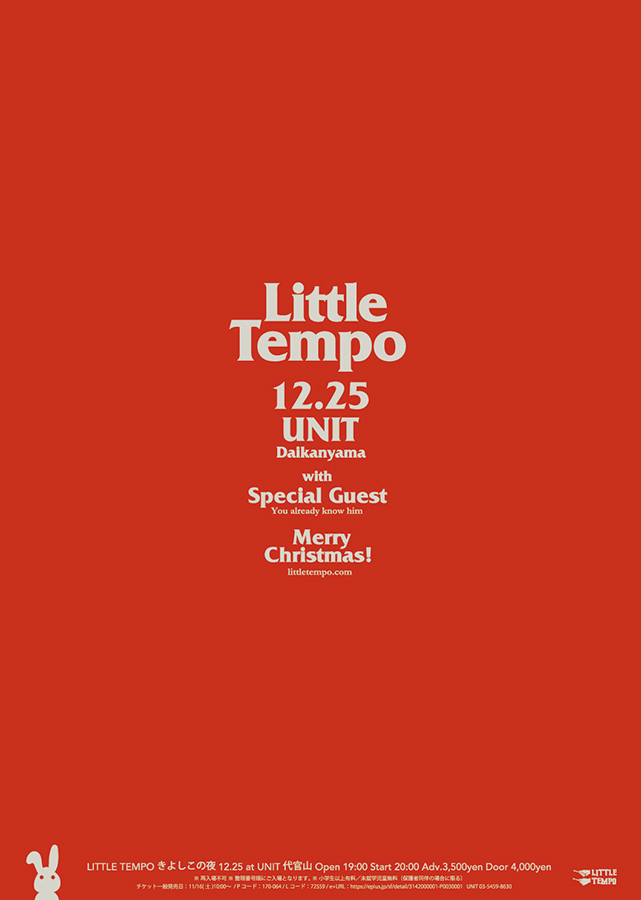 今回で15年目を迎えるLITTLE TEMPOのクリスマス・ライヴ。今回は、“今年はご縁があったあの人”をスペシャル・ゲストとして招いてのパフォーマンスが予定されています。前売チケットはe+、ローソンチケット、チケットぴあにて販売中。