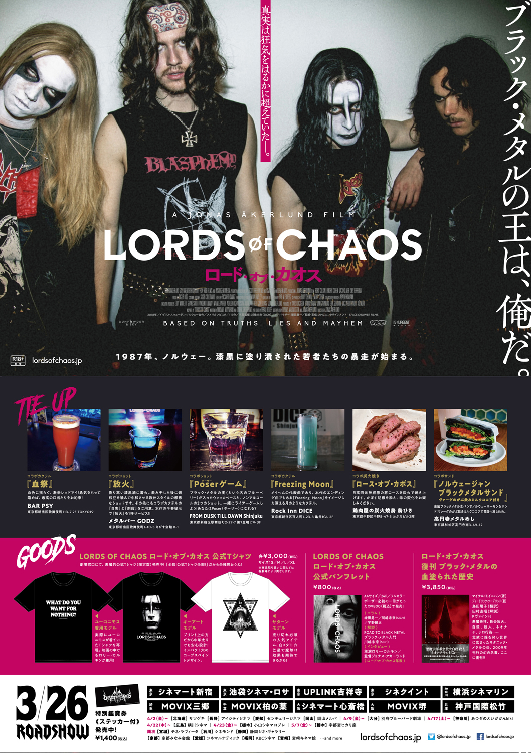 また、東京・新宿「Rock Inn DICE」「Bar FROM DUSK TILL DAWN Shinjuku」「GODZ」「BAR PSY」、中野「鳥ひさ」、高円寺「高円寺メタルめし」では“応援店”として映画とのコラボレーション・メニューのサーブがスタート。東京・タワーレコード新宿店では、原作書籍『ブラック・メタルの血塗られた歴史』(マイケル・モイニハン + ディーデリック・ソーデリンド著)の復刊を記念したパネル展示や、同書の購入者を対象に、抽選で映画の招待券が当たるキャンペーンが実施されます。