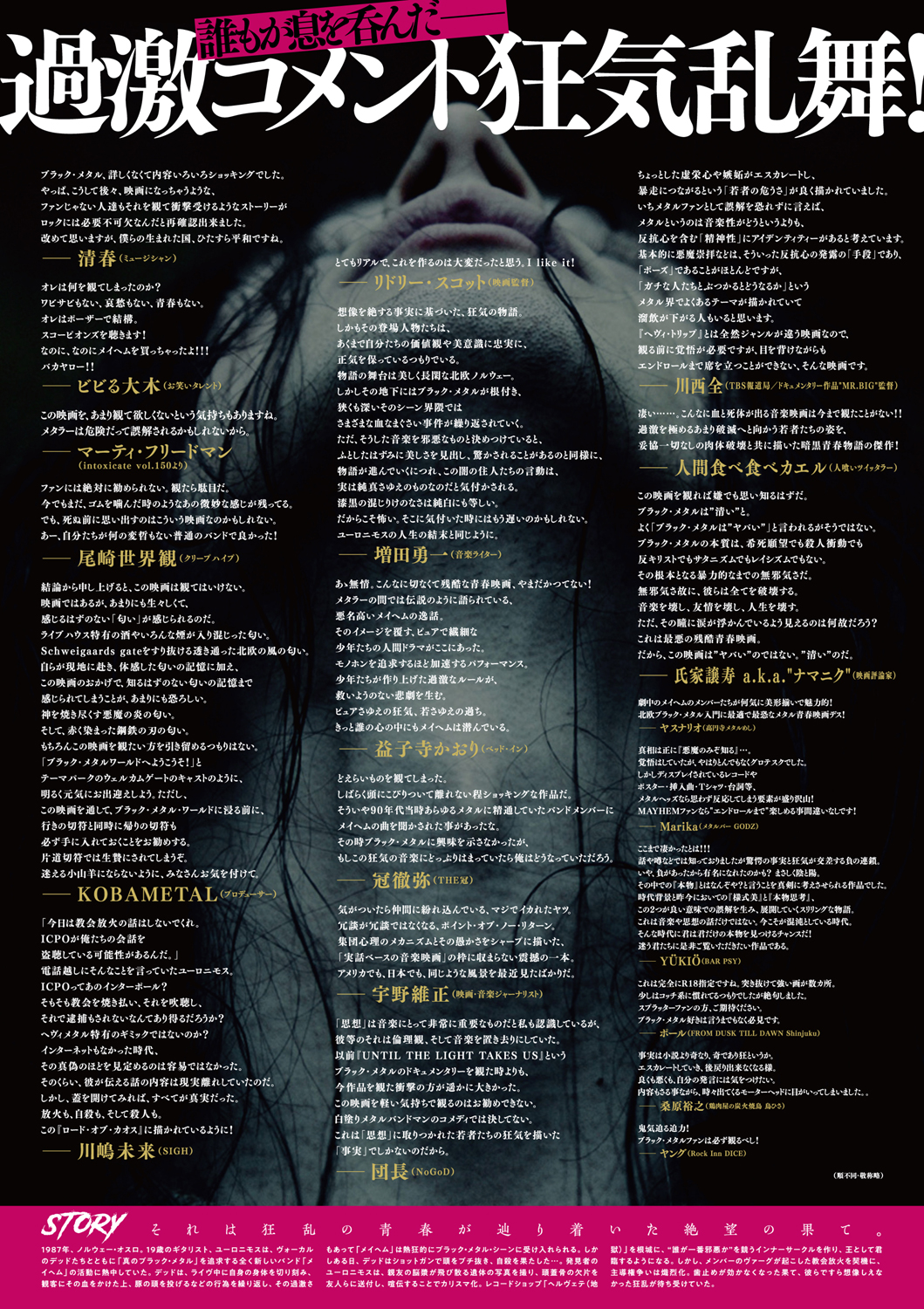 1990年代初頭のノルウェイジャン・ブラックメタルにまつわる事象を、マッツ・ミケルセン主演の目下最新作『ポーラー 狙われた暗殺者』(2019)も好評を博したジョナス・アカーランド監督が故・Øystein Aarseth aka Euronymous(MAYHEM | Deathlike Silence Productions)の生涯を描く物語として映像化した映画『ロード・オブ・カオス』が、3月26日(金)より東京・シネマート新宿、シネマート心斎橋ほかにて順次ロードショウ。公開に先駆け、団長(NoGoD)、マーティ・フリードマン(『intoxicate』vol.150 より)、冠 徹弥(THE 冠)、川西 全(TBS報道局 | ドキュメンタリー作品『MR.BIG』監督)、川嶋未来(SIGH)、清春(ミュージシャン)、KOBAMETAL(プロデューサー)、増田勇一(音楽ライター)、益子寺かおり(ベッド・イン)、人間食べ食べカエル(人喰いツイッタラー)、ビビる大木(お笑いタレント)、尾崎世界観(クリープハイプ)、氏家譲寿 aka ナマニク(映画評論家)、宇野維正(映画・音楽ジャーナリスト)から寄せられたコメントを掲載するフライヤーの配布が開始されています。