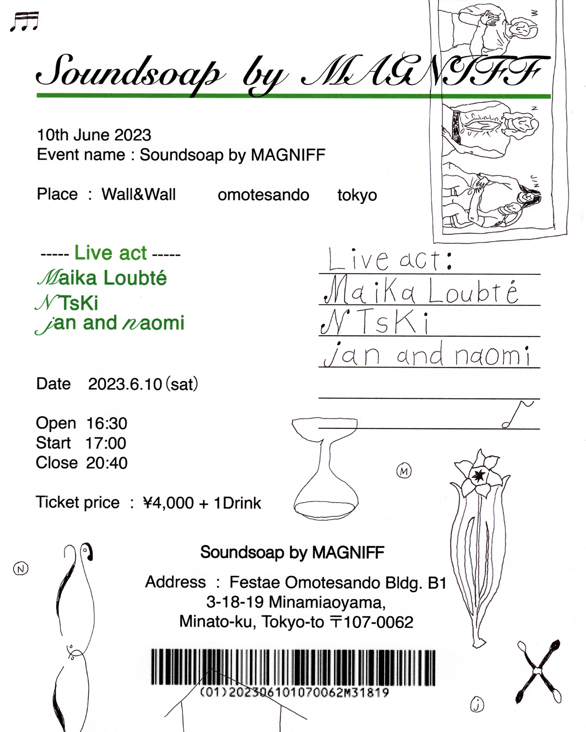 昨年末に始動したスキン / ボディケア・ブランド「MAGNIFF」が、ローンチ・イベント「Soundsoap」を6月10日(土)に東京・南青山 WALL & WALLにて開催。jan and naomi、Maika Loubté、NTsKiの出演が発表されている同イベントでは、東京・恵比寿 KATA(LIQUIDROOM 2F)での初単独公演を6月16日(金)に控えるtamanaramenよりHana WatanabeがVJを担当。Bungo(FLATTOP)、NAGIによるスピンも決定しています。