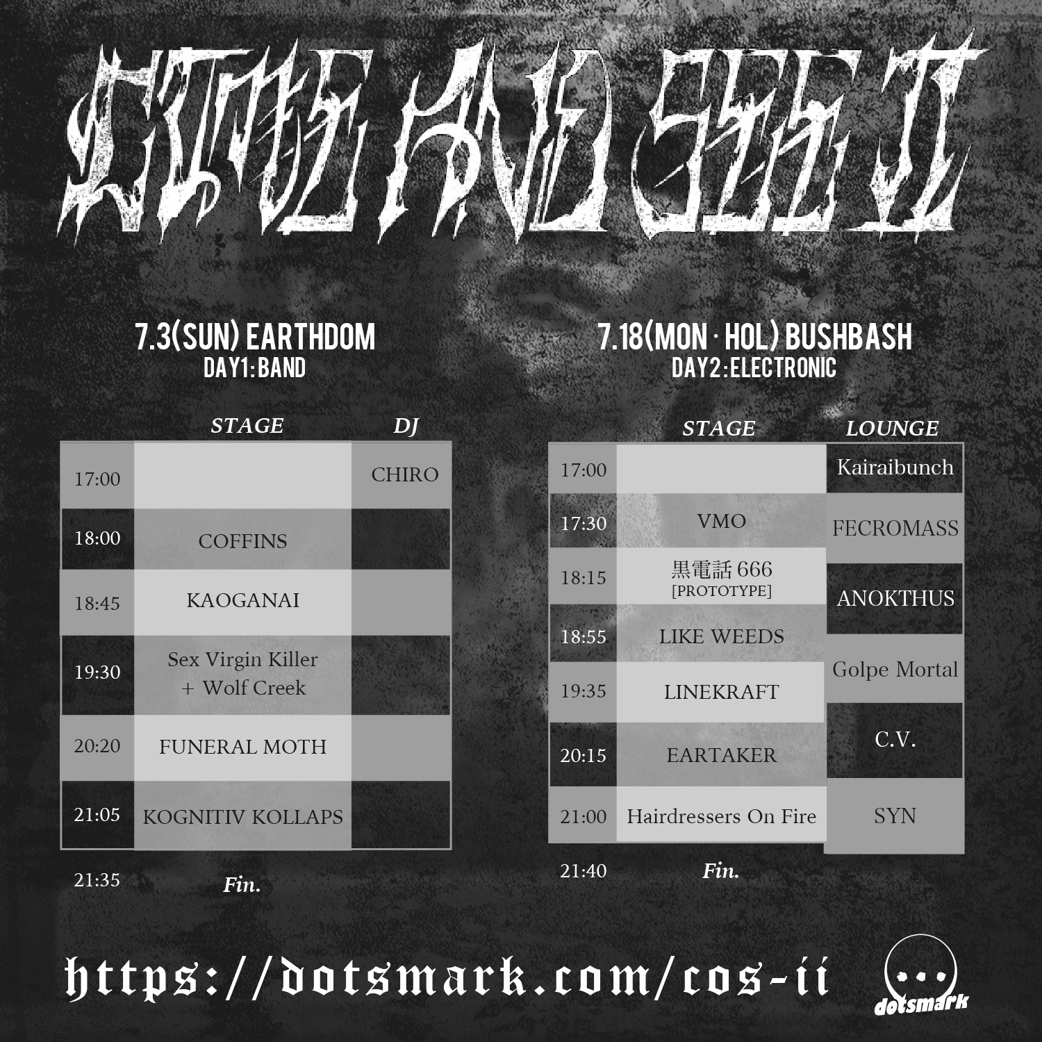 共演はCHIRO、COFFINS、FUNERAL MOTH、顔がない、Sex Virgin Killer + Wolf Creek(以上EARTHDOM)、ANOKTHUS、C.V.、DEAD BITCH、EARTAKER、FECROMASS、Golpe Mortal、黒電話666、LIKE WEEDS、LINEKRAFT(以上BUSHBASH)。BUSHBASHではKAIRAI BUNCHによるインスタレーションの出展も予定されています。開催に先立ち、DJ・SatosicKによるイベントのイメージ・プレイリストが公開中。