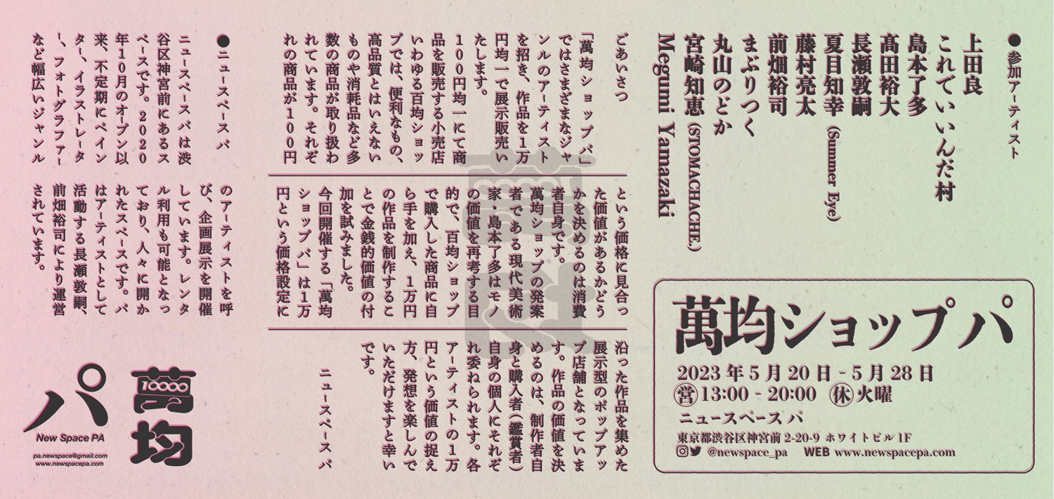 現代美術家・島本了多の発案のもと、様々な作家の作品を1万円均一で展示販売する企画「萬均ショップ パ」が5月20日(土)から28日(日)まで東京・神宮前 ニュースペース パにて開催されます。