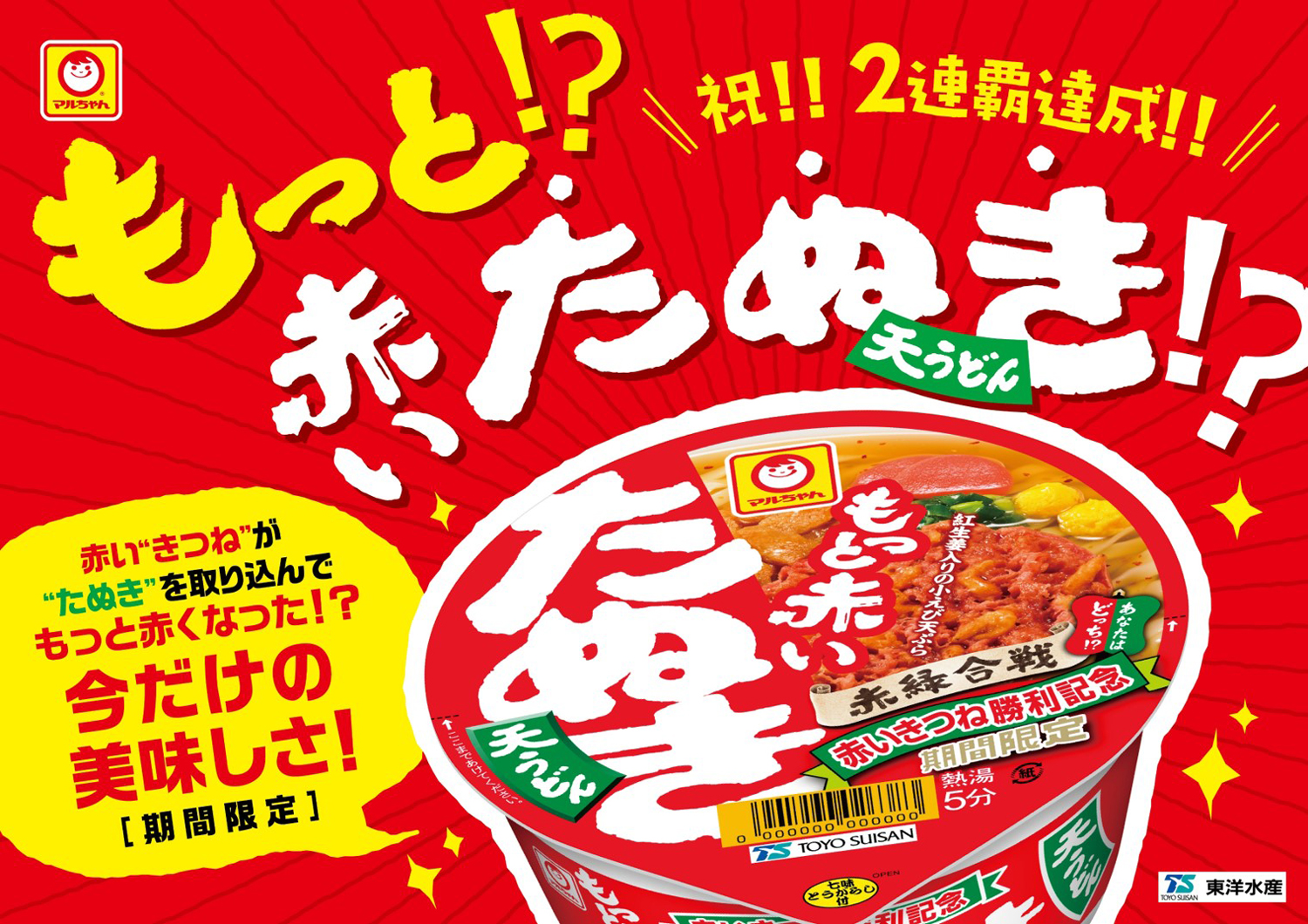 『赤いきつねうどん』『緑のたぬき天そば』シリーズでおなじみの東洋水産株式会社「マルちゃん」ブランドが、昨年5月に期間限定で発売して話題となった『マルちゃん 赤いたぬき天うどん』をヴァージョン・アップ。期間限定商品『マルちゃん もっと赤いたぬき天うどん』(101g) | 193円 + 税)の販売が5月18日(月)からスタートします。