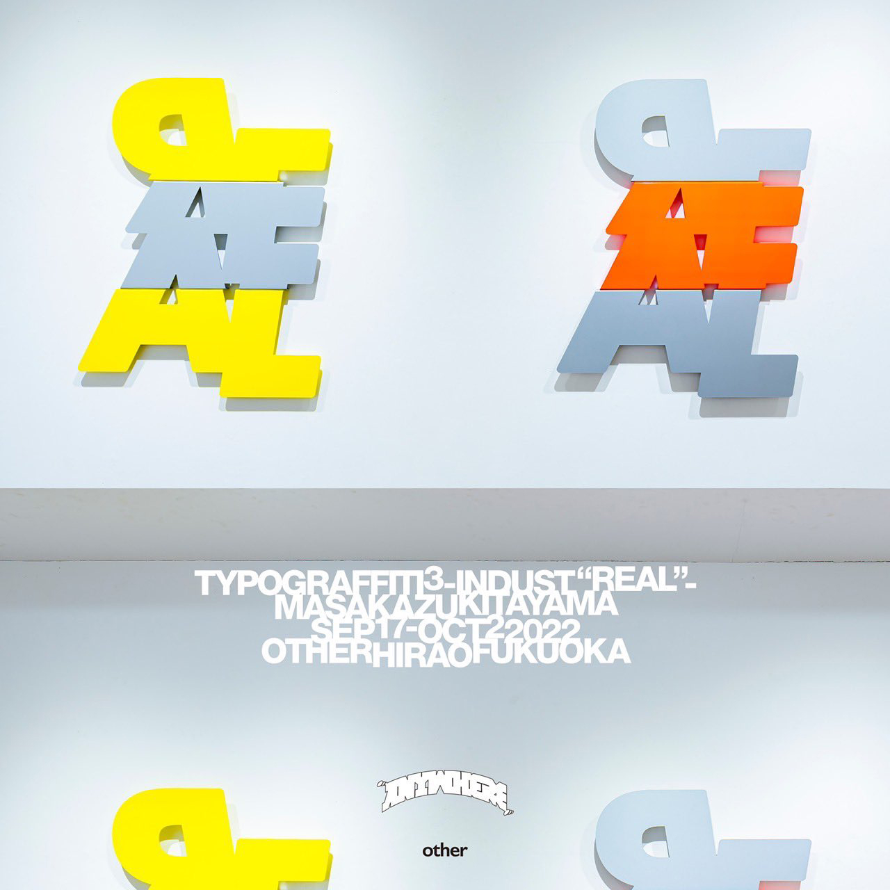 福岡では初の個展となる同展には、2015年より取り組む「TYPOGRAFFITI」シリーズの近作を出展。シリーズのシグネチャとなっているアクリルやミラーに、アルミニウムも素材として加わった「INDUST "REAL"」のタイトルには、大量生産の技法を少量生産に用いるスタイルや、フェイス・トゥ・フェイスへの回帰、フェイクへの疑念といったテーマを内包しているとのこと。