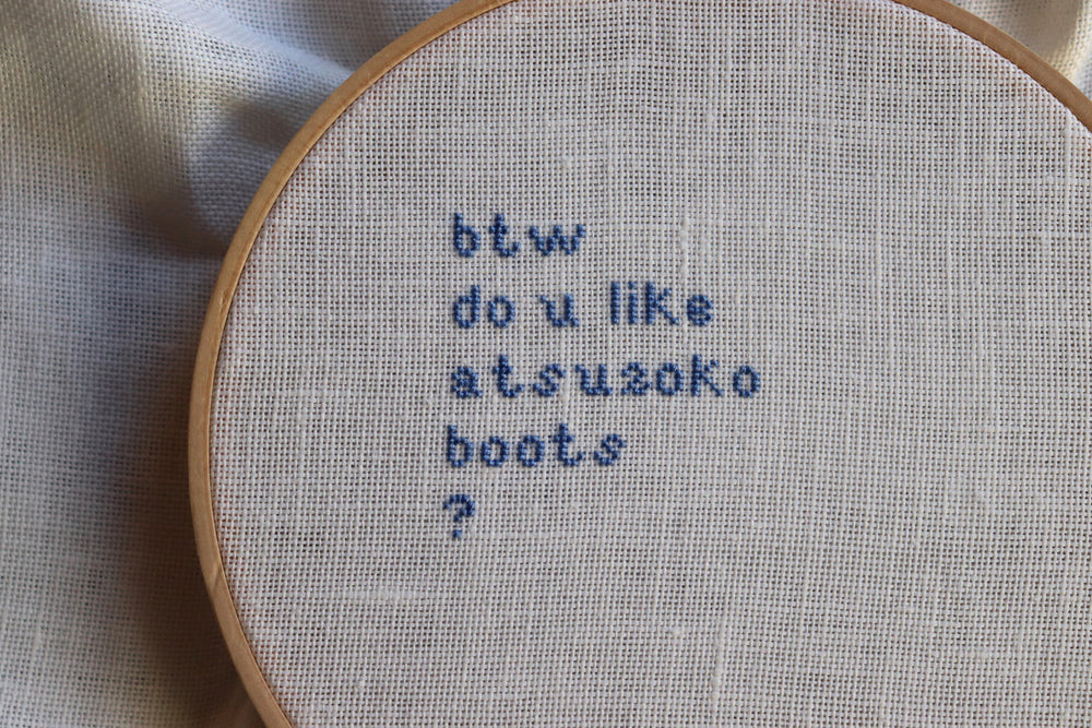 さて、今回の展示では20年周期で訪れるファッショントレンドにならい、中学生時代を過ごした2000~2003年くらいの時期に焦点を当ててみます。個人的Y2Kはどんな“少年”時代であったか、そしてどんな意味を持っていたのだろうか。刺繍そして小さな文章と共に見つめなおしてみる作品です。