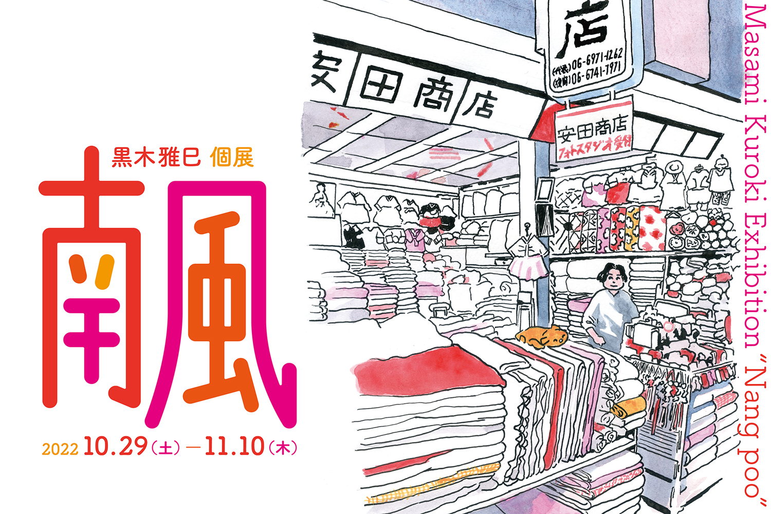 どついたるねん、シャムキャッツなどのアートワークや、本の装丁、雑誌の装画などを手がける黒木。「南風」では、「街のいろんなお店に感じる南国情緒や怪しげな雰囲気に妙に惹かれる」という黒木が“お店”をテーマに描いたイラスト作品を中心に展示販売。