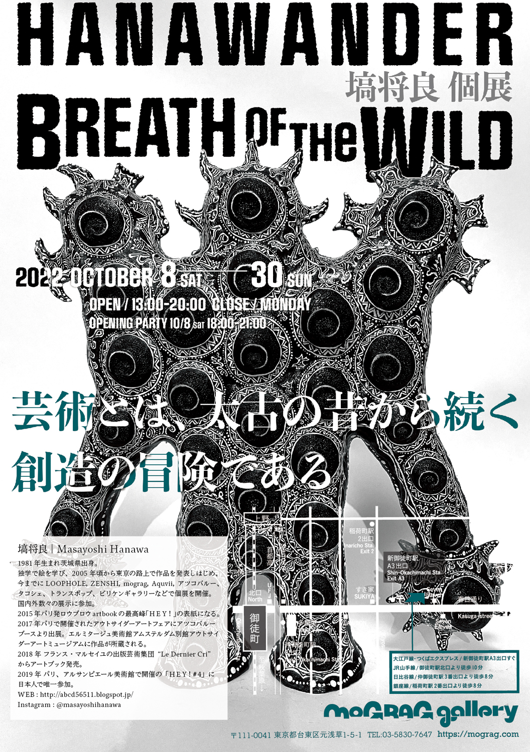 今年は仏パリで9月に開催された「Outsider Art Fair Paris 2022」に参加したペインター・塙 将良が、ソロ・エキシビション「BREATH OF THE WILD」を東京・新御徒町 mograg galleryにて10月8日(土)から30日(日)まで開催。
