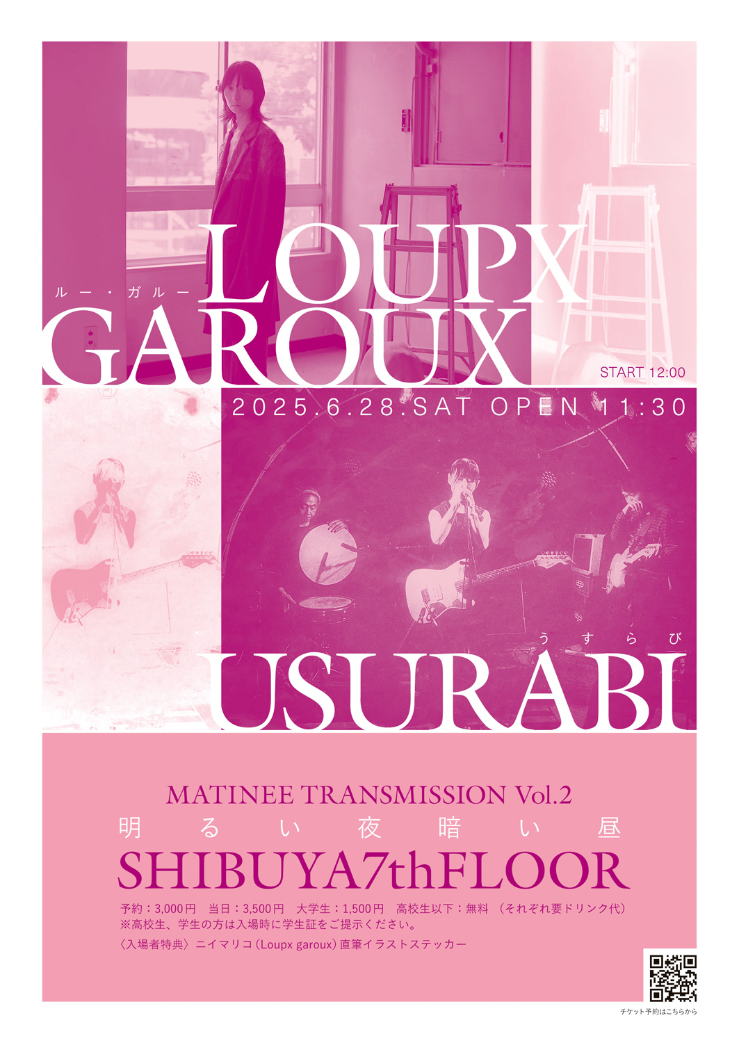 同公演には、昨年の初フル・アルバム『暗野』が話題を呼んだニイマリコのリーダーバンド・Loupx garouxと、同年に仏「An'archives」より3rdフル・アルバム『Chita』をリリースしたうすらび(川口雅巳 + 諸橋茂樹 + 利光暁子)が出演。来場者には特典として、ニイマリコ直筆のイラストをフィーチャーしたステッカーが配布されます。