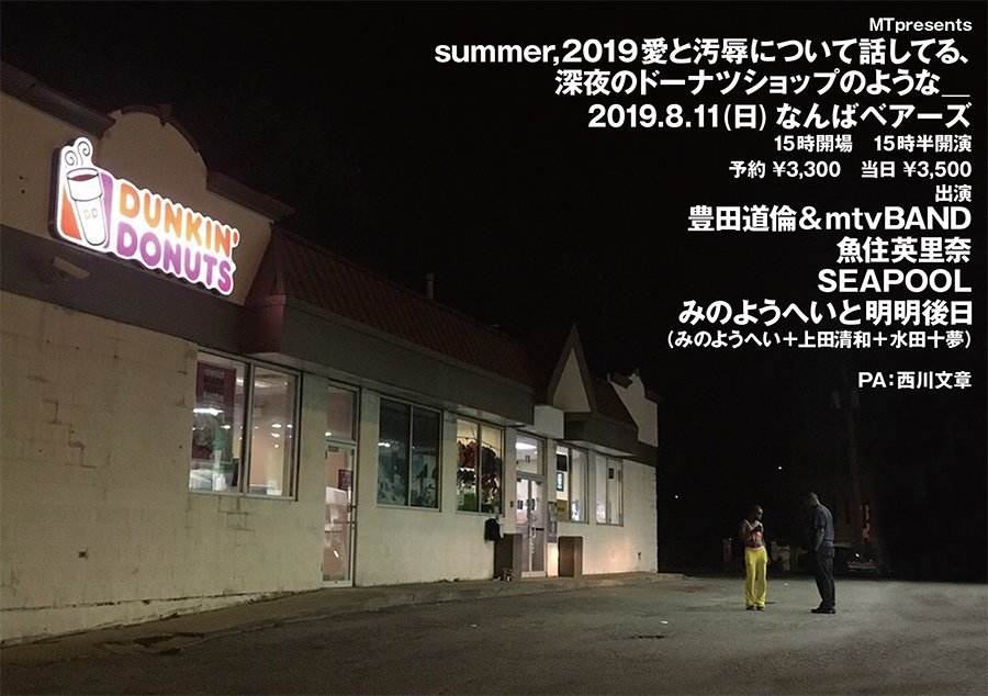 昨年10月に“パラダイス・ガラージ”名義で発表された『愛と芸術とさよならの夜』以降、本人名義での『サイケデリック・ラブリー・ラスト・ナイト』『夜路死苦ファンタジア』、パラダイス・ガラージ『SAN FRANSOKYO AIRPORT』のリリース・ラッシュが続き、8月7日(水)に発売された川本真琴最新作『新しい友達』へのギタリストとしての参加も話題となっている豊田道倫が、毎夏恒例となっている自主企画を今年も敢行。「MT presents “summer, 2019 愛と汚辱について話してる、深夜のドーナツショップのような_”」が8月11日(日)に大阪・難波 BEARSにて開催されます。