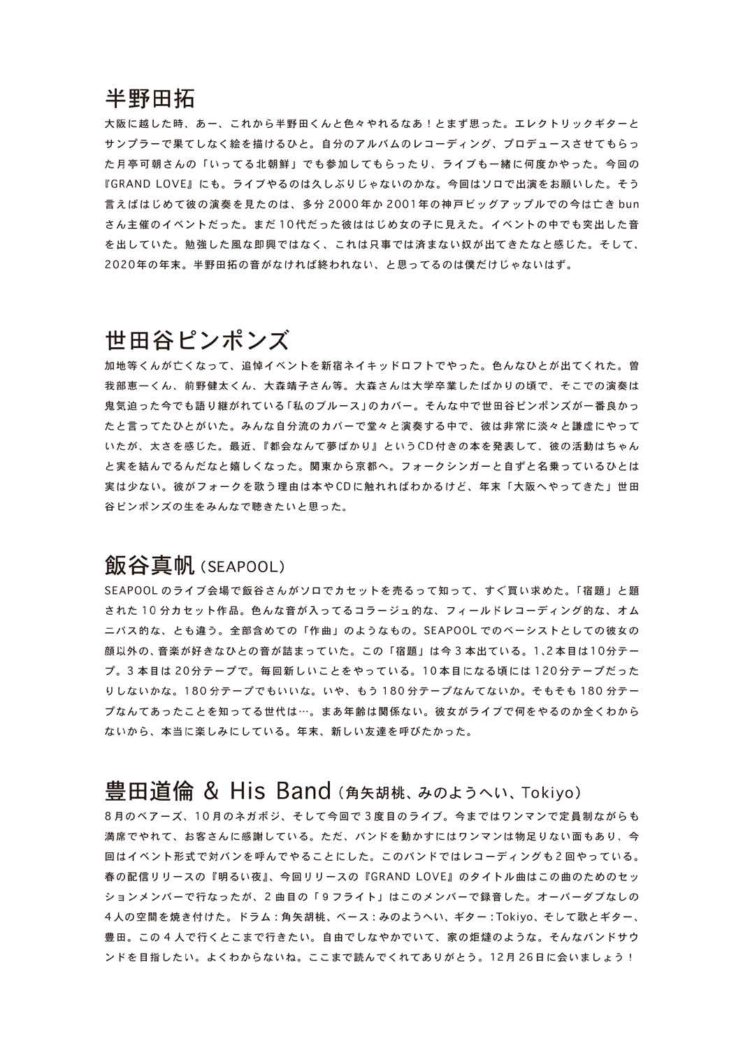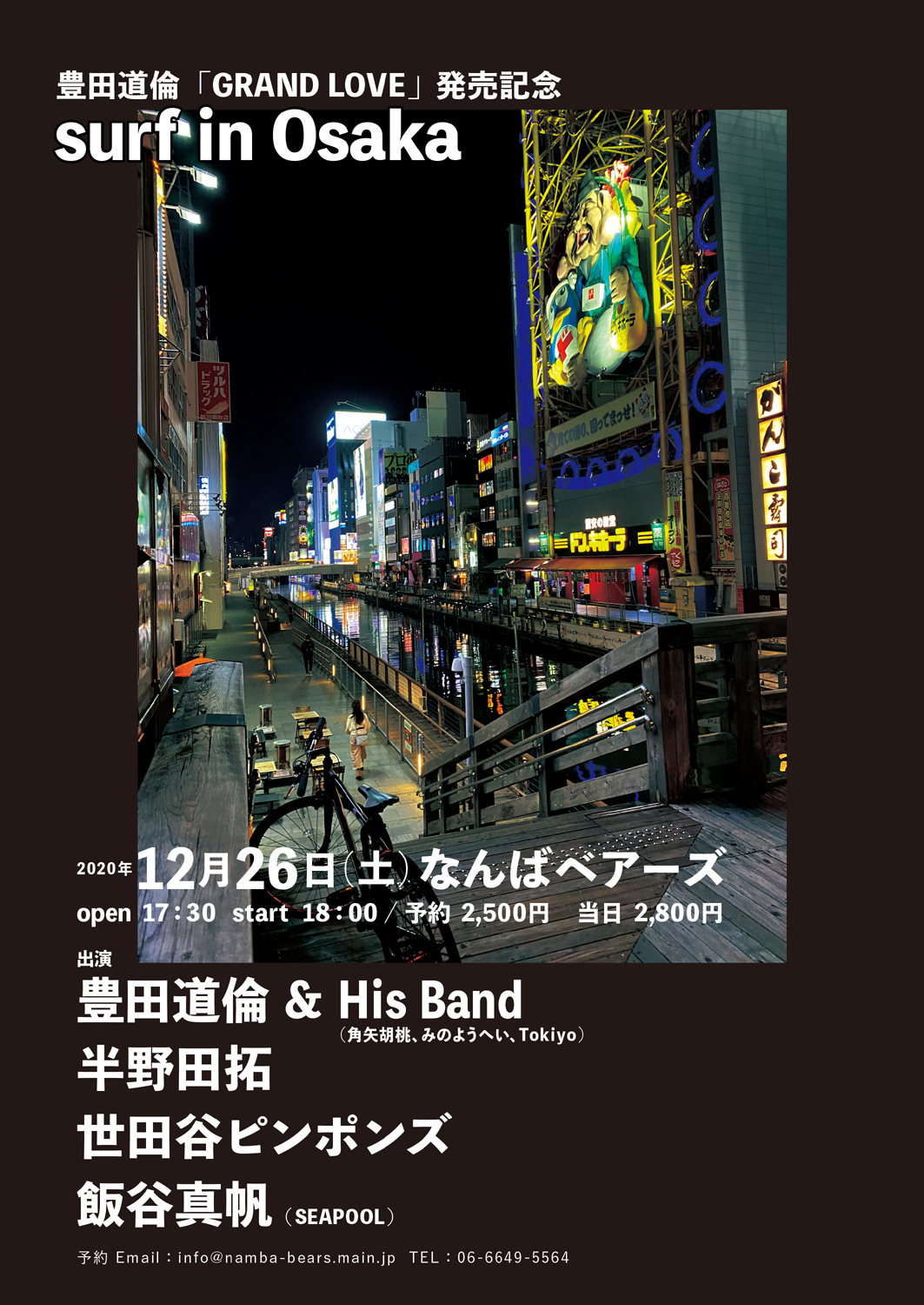 また、発売後には東阪でのリリース・ライヴも開催。12月26日(土)に大阪・難波 BEARSで開催される公演「豊田道倫『GRAND LOVE』発売記念 “surf in Osaka”」には、豊田ソロおよび豊田道倫 & His New Bandに加え、半野田 拓、世田谷ピンポンズ、飯谷真帆(SEAPOOL)も出演。12月30日(水)東京・四谷 OUTBREAK!での「豊田道倫『GRAND LOVE』発売記念コンサート」は、豊田ソロでの単独公演。なお12月31日(木)には、大阪・北堀江 FUTURO Cafeでの「豊田道倫ソロコンサート」の開催も決定しています。