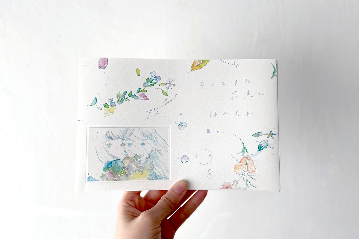 同展では、新作を展示販売。同時販売の本『そしてまた花束に』の表紙は空押しに題箋を手貼りしたもの。作家による一部手描き絵が入った特別ケースが付属する50部限定の愛蔵版も販売されます。会期中の2月6日(日)20:00頃からSUNNY BOY BOOKSのInstagramにて実施されるオンライン・イベントでは、店主・高橋和也と清水による展示作品や本についてのトークなどを予定。