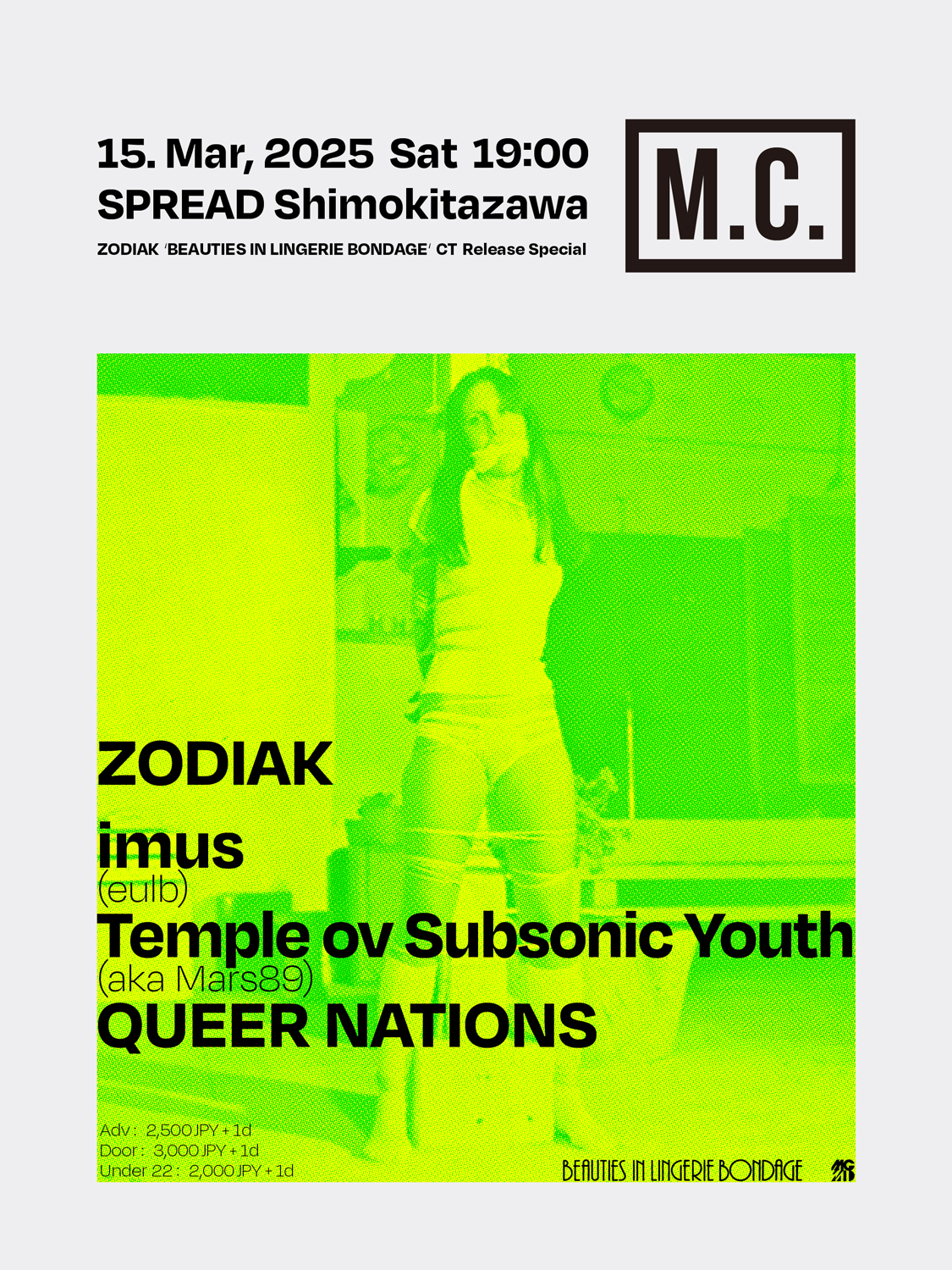 CARREとPhewのライヴ、浮舌大輔の映像とドローン、pooteeのDJで東京・桜台 poolにて行われた前回以来、約10年ぶりの開催となる「MINIMAL COMPACT」。今回は、Takashi Makabe aka Zodiakが1月に発表した最新ミックステープ『Beauties in Lingerie Bondage』のリリースを記念兼した公演。Zodiak、QUEER NATIONSの出演に加え、昨年1周年を迎えた「eulb」のオーガナイザーでもあるimusのDJと、Albino Soundとのコラボレート作『Organs』(Nocturnal Technology)が好評を博しているMars89によるTemple Ov Subsonic Youth名義でのライヴ・パフォーマンスが決定しています。