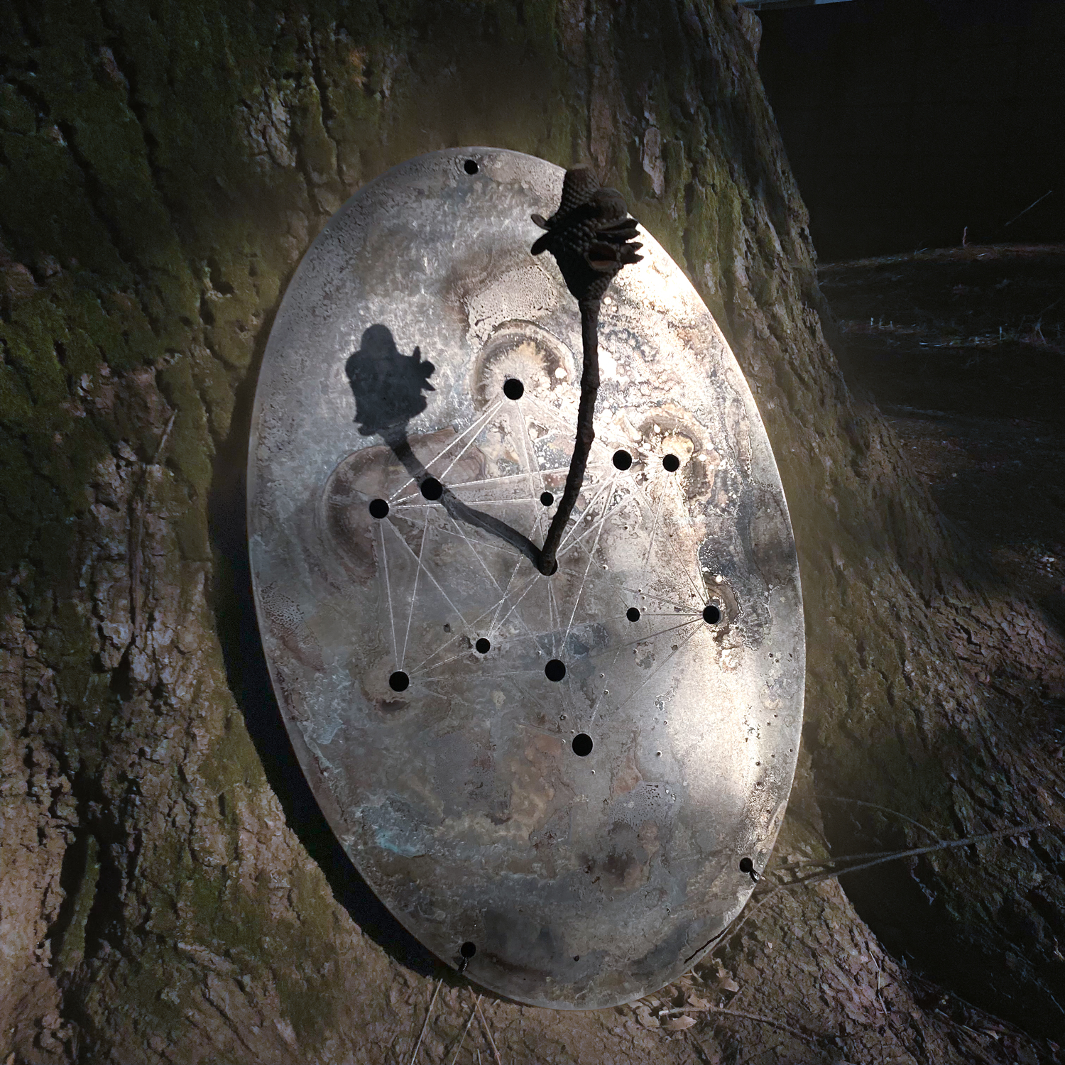 「Symchtchonia」のカバー画像にある錆びたプレートは、2023年2月に開催されたアートフェア「EastEast_Tokyo」で発表したパフォーマンス/インスタレーションから由来したもので、金属製のプレートには、John B.Calhounによる図式が刻まれており、混沌と絶滅に至ったネズミのユートピア実験“Universe 25”から差し引いた社会構造におけるニーズ、条件、適応の緊張と因果関係を示している。“Universe 25”は、集団主義や平等主義のアプローチに対する反動的な議論として使われることがあまりにも多い。しかし、ここでは、錆びたプレートに植物が刺さっており、ネズミの社会を根絶やしにしたのは、豊富な資源や直接アクセスではなく、生態系の予測不可能性やその多様性から人為的に強制的に隔離されたことかもしれないと示唆している。