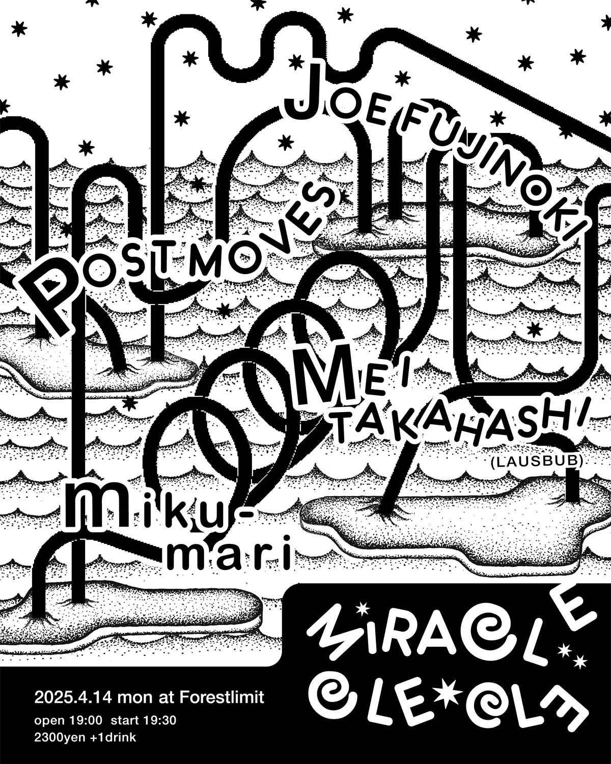 現代の東京を象徴すると言って差し支えないであろう音楽が日々鳴らされている東京・幡ヶ谷のホットスポット「Forestlimit」が、4組のライヴ・アクトを迎えるイベント「𝑀𝐼𝑅𝒜𝒞𝐿𝐸 𝒞𝐿𝐸-𝒞𝐿𝐸」を4月14日(月)に開催。