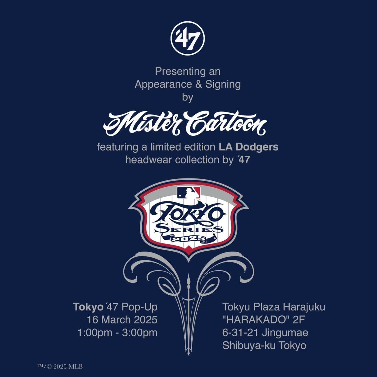 なおMister Cartoon x '47コラボレート・キャップは、「'47」オンライン・ストアや東京・六本木ヒルズのポップアップ・ストア、東京ドームの「MLB 東京シリーズ 2025」オフィシャル店舗でも販売されます。