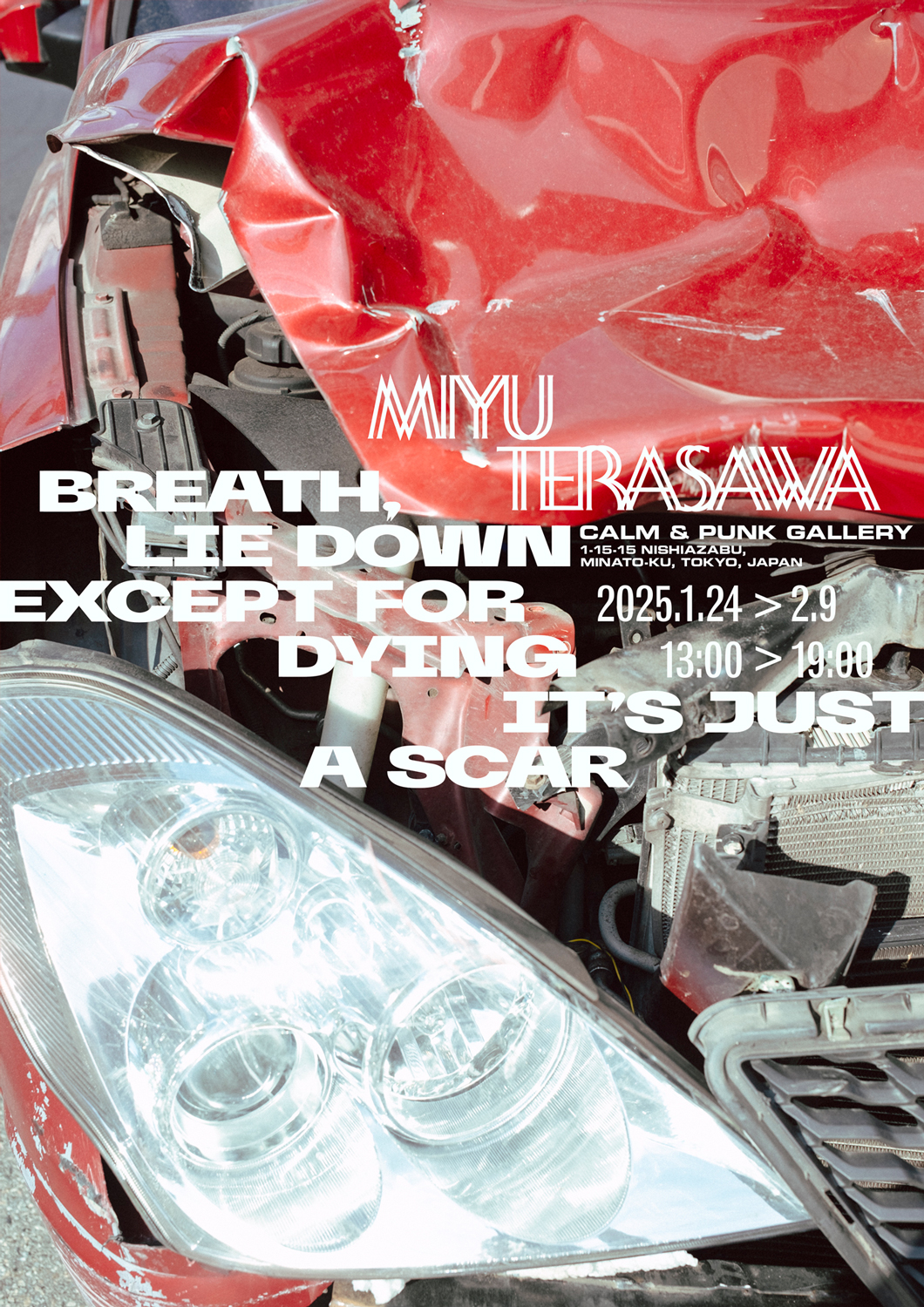2021年の個展「UNOWNED」(東京・初台 LAID BUG)を皮切りに、自動車を被写体にした撮影を継続している寺沢。東京では約3年半ぶりのソロ・エキシビションとなる「BREATH, LIE DOWN EXCEPT FOR DYING IT'S JUST A SCAR」では、韓国・聖水洞で撮影された事故車をモチーフにした作品や、新たに日本で制作された作品を展示。会場内では、同展に合わせて制作されたジン + 選曲 / ミックスを手がけた音源『E-400』も販売されます。ジンの編集 / デザインは緒方数馬、ミックステープのマスタリングは田口 黎。フライヤーのデザインは杉山峻輔によるもの。初日の1月24日(金)にはオープニング・レセプションを実施。