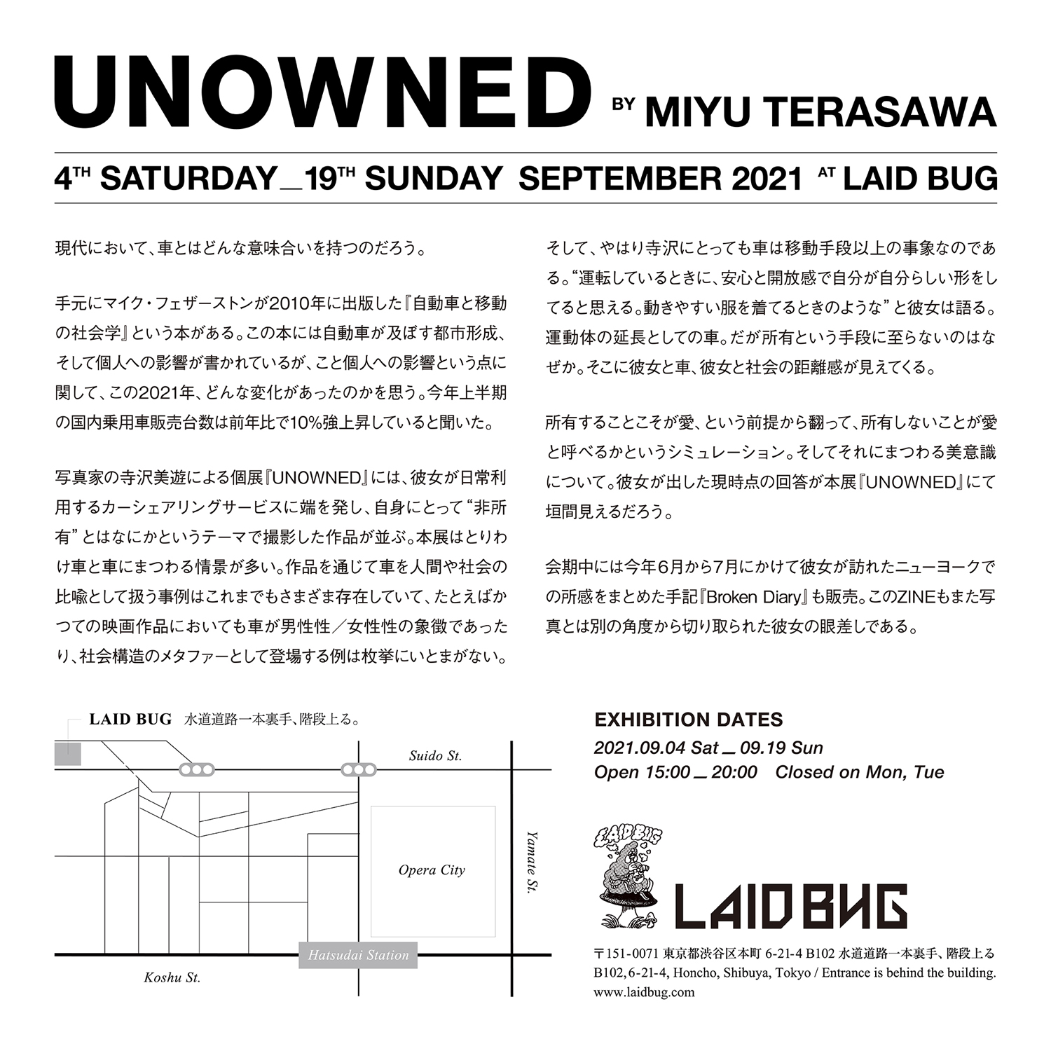 寺沢が日頃から利用するカーシェアリング・サービスが発端という同展では、“非所有とはなにか”をテーマに撮影された車と車にまつわる情景の写真を展示販売。会場内では、今年6月から7月にかけて寺沢が訪れた米ニューヨークでの体験を綴った手記『Broken Diary』も販売されます。