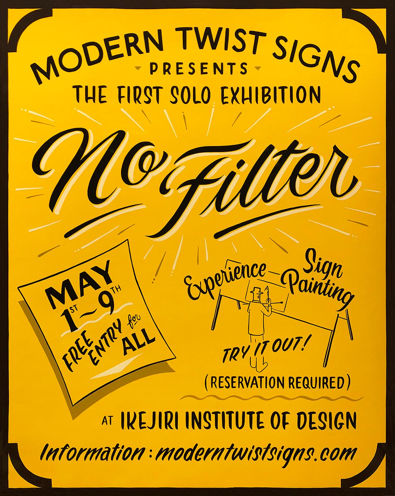 東京・池尻 IID 世田谷ものづくり学校内にスタジオを構えるサイン・ショップ「Modern Twist Signs」が、エキシビション「Modern Twist Signs Solo Exhibition “No Filter”」を同地のギャラリーで5月1日(土)から9日(日)まで開催。