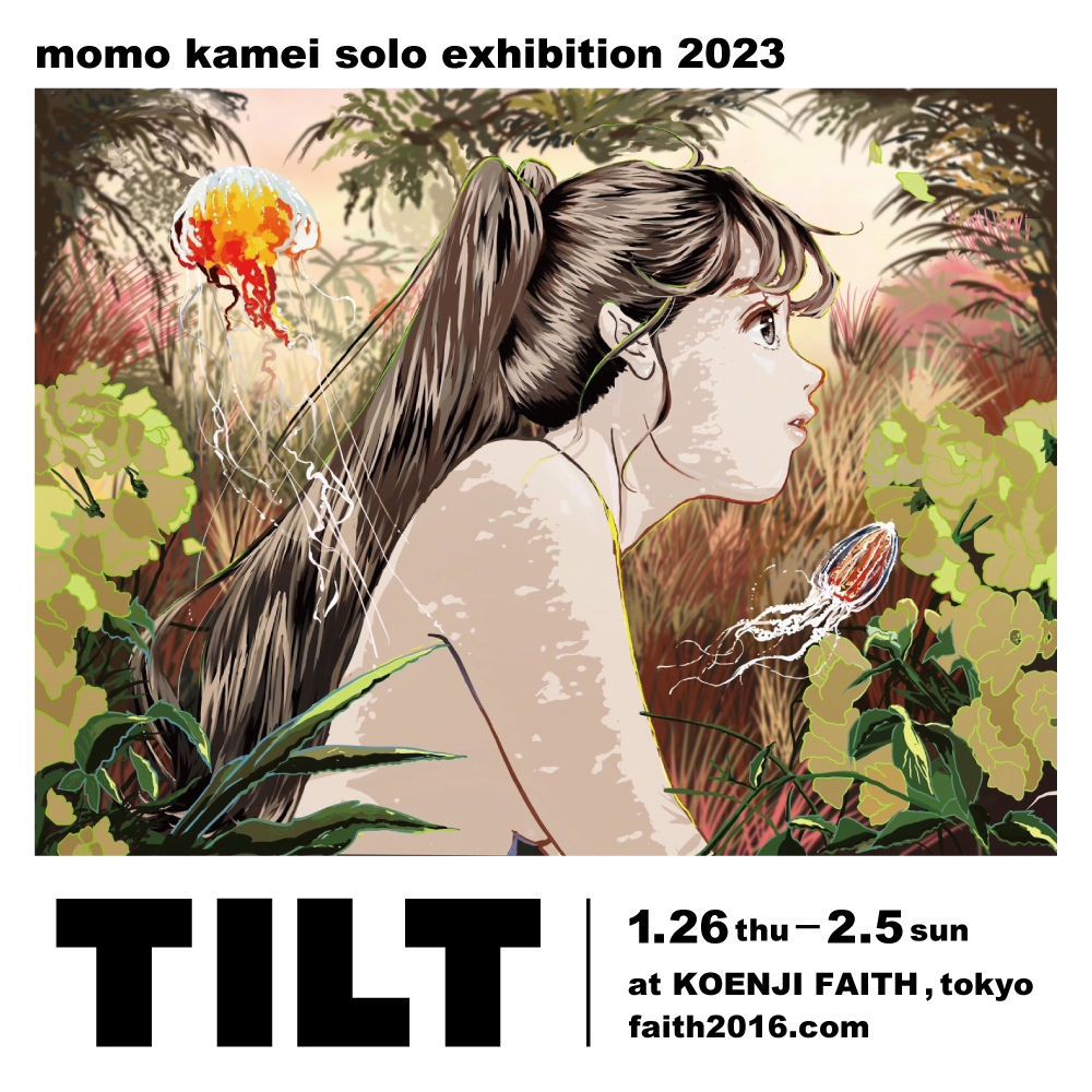 昨年はRYUTistのツアー・マーチのイラストや、宮城・仙台駅の駅ビル「エスパル仙台」のキャンペーン「Have fun Christmas!」のメイン・ヴィジュアルなどを手がけ、FREAK'S STORE仙台店にてポップアップ・ショップを開催するなど、多方面で活躍するイラストレーター / デザイナー・亀井 桃が、東京では初となるソロ・エキシビション「TILT」を1月26日(木)から2月5日(日)まで東京・高円寺 FAITHで開催。