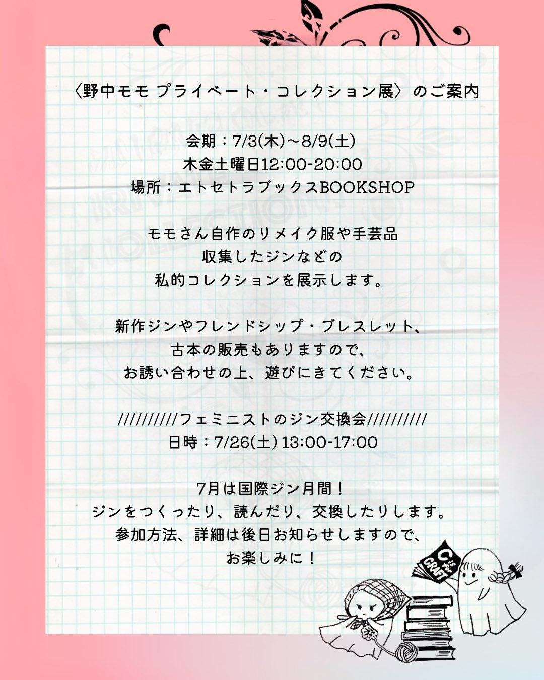 『野中モモの「ZINE」 小さなわたしのメディアを作る』(晶文社)、『デヴィッド・ボウイ――変幻するカルト・スター』(筑摩書房)などの著書や、ナージャ・トロコンニコワ『読書と暴動 プッシー・ライオットのアクティビズム入門』(ソウ・スウィート・パブリッシング)、ヴィヴィエン・ゴールドマン『女パンクの逆襲――フェミニスト音楽史』(P-VINE)などの訳書で知られる翻訳家 / ライター・野中モモが、「プライベート・コレクション展」を7月3日(木)から8月9日(土)まで東京・新代田 エトセトラブックスBOOKSHOPにて開催。