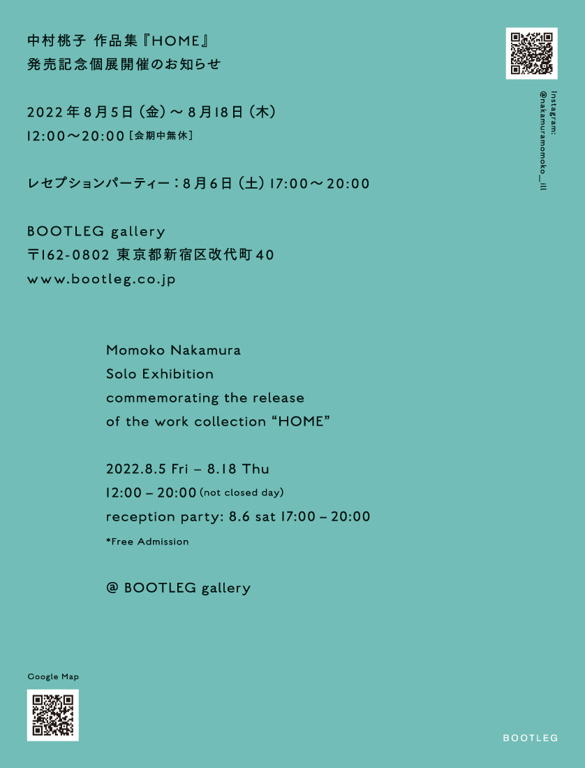 各地で精力的な展示活動を続け、11月には台湾・台北 fruit hotel taipeiでの個展開催も決定している画家・中村桃子が、2019年の『HEAVEN』以来約3年ぶりの作品集『HOME』を「BOOTLEG」より刊行。これを記念したソロ・エキシビションが東京・江戸川橋 BOOTLEG galleryにて8月5日から18日(木)まで開催されています。