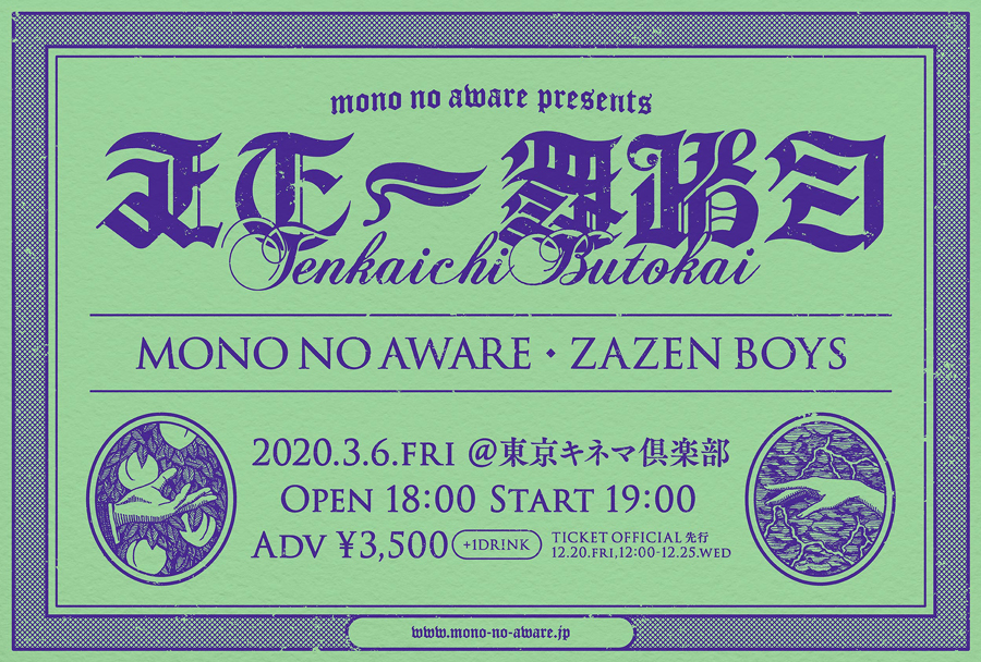 ドキュメンタリー映画『沈没家族 劇場版』の主題歌「A・I・A・O・U」、NHK「みんなのうた」に書き下ろした「かむかもしかもにどもかも!」を含む全13曲のアルバム『かけがえのないもの』を10月にリリースしたMONO NO AWAREが、2020年3月6日(金)にZAZEN BOYSをゲストに迎える自主企画イベント「天下一舞踏会 2020」を東京・鶯谷 東京キネマ倶楽部にて開催。ZAZEN BOYSとのツーマン・ライヴは、今年3月に東京・渋谷 TSUTAYA O-EASTで開催された公演以来2回目です。前売チケットのオフィシャル先行(抽選)受付は12月20日(金)12:00から25日(日)11:00まで。