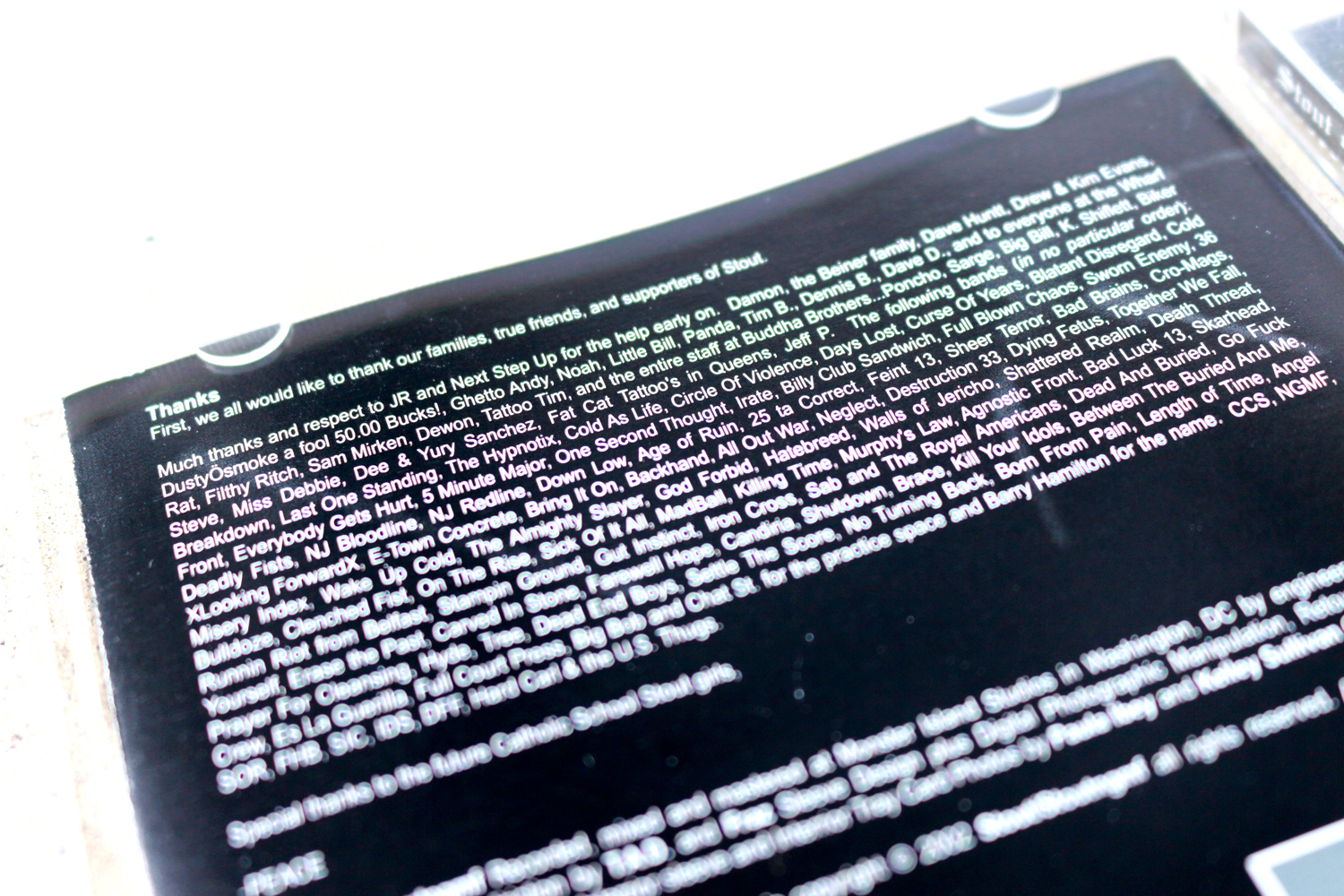 M 「2002年だからアルバムをリリースしたばかりなんですよ。WDsoundsでINTEGRITYを出したのが2004年で、そのきっかけって、このSIDEBARでDom(Domenic Romeo | DAY OF MOURNING, END REIGN, ILSA, PULLING TEETH, SLUMLORDS etc. | A389 Recordings)に会ったからだから。しかもAGENTS OF MANと一緒にSIDEBARに行っていて、出かける前にMike(Milewski | BULLDOZE, HOMICIDAL, TRAIN OF THOUGHT, HOLD MY OWN etc.)もNJの家にいたから、SIDEBARにSTOUTのメンバーがいたかは定かではないですけど、BULLDOZEはAOMのメンバー + Mikeだから、そのボルティモアでの1日で経験した人とバンドが一気に日本に来るっていう。それをSTOUTの話をしようって用意していたときにぱっと思い出した。SLUMLORDSも“Member of...”のところは“ex-BREAKDOWN、STOUT、NEXT STEP UP、ex-DAY OF MOURNING”ってなってますもんね」