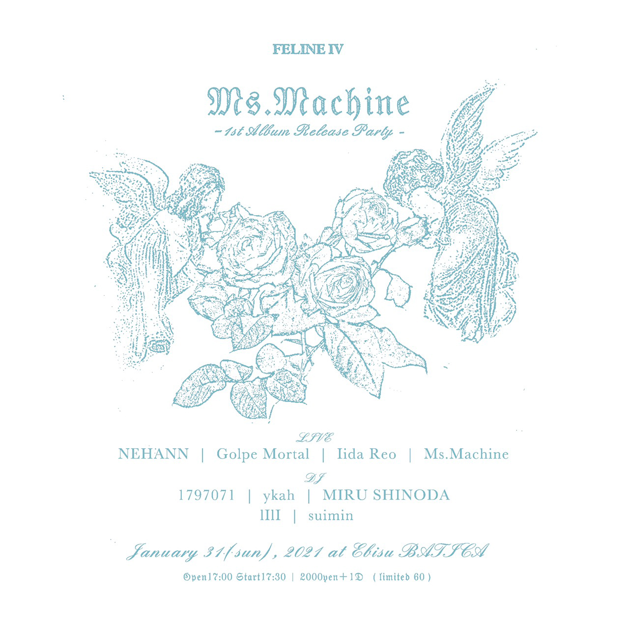 なお、定員60名で開催される「FELINE IV」では、Ms.Machineに加えてGolpe Mortal、iida reo、NEHANNがライヴ・パフォーマンス。DJとしてMAKO aka 1797071、lIlI、篠田ミル(yahyel)、suimin、ykahの出演が決定しています。